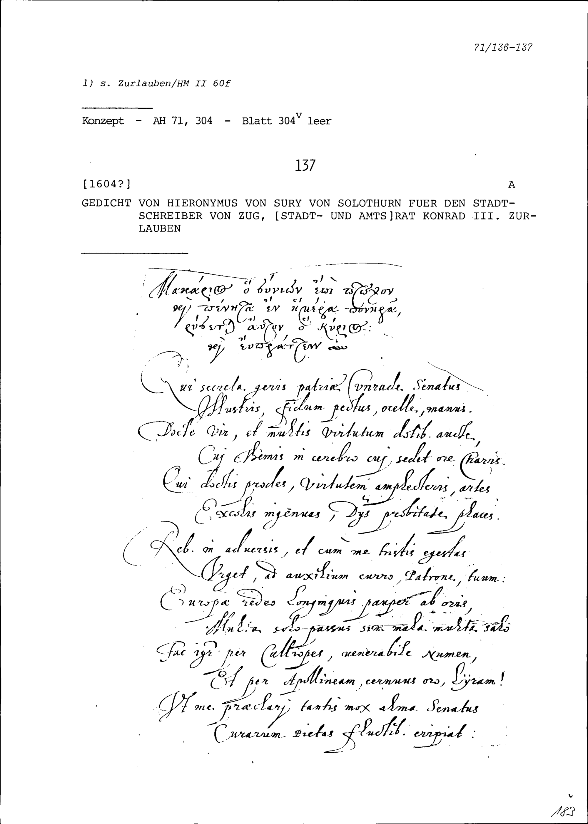 Schreiben von Konrad III. Zurlauben, Gardehauptmann, an Ludovico di Sarego, Nuntius