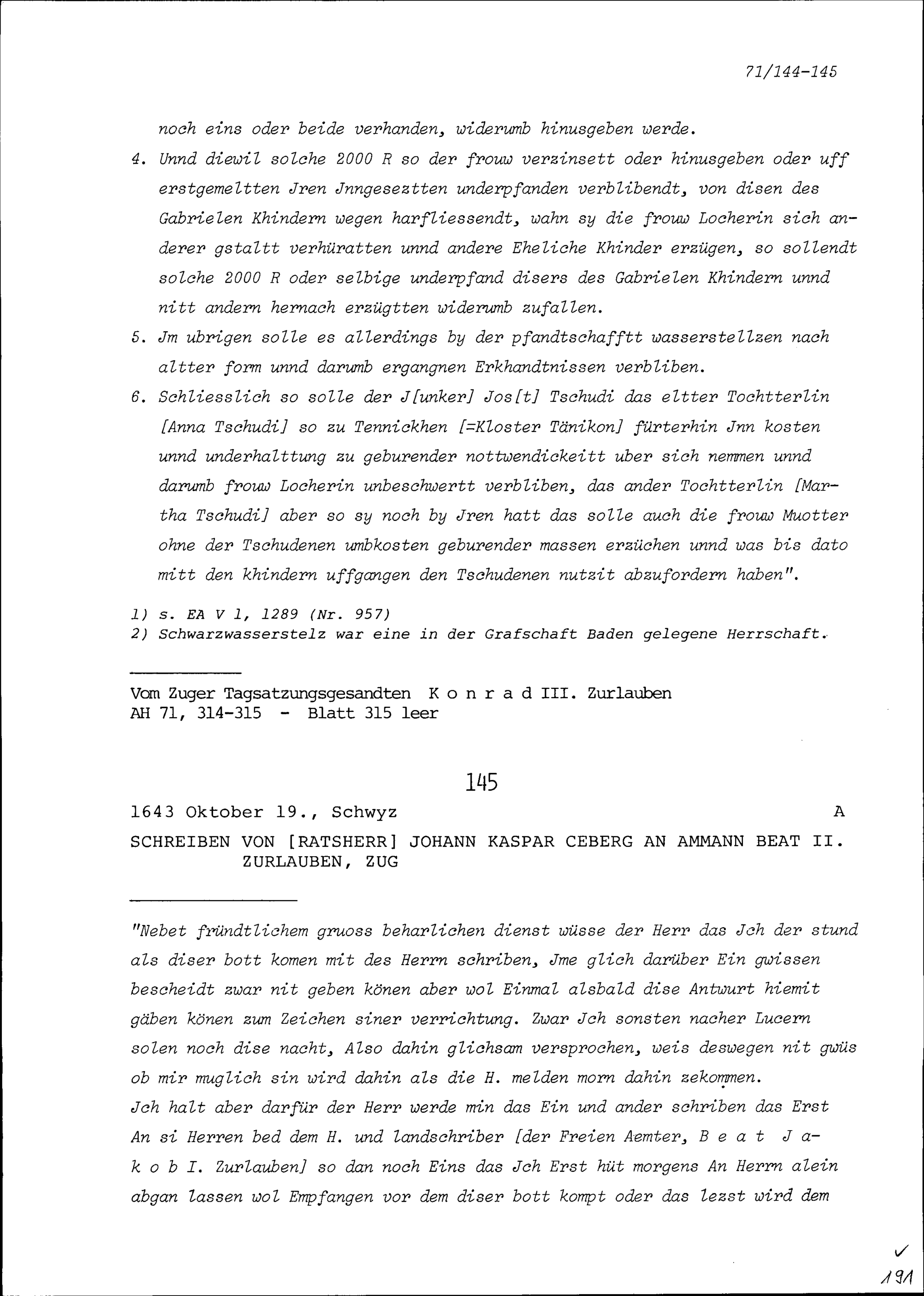 Abschied der Jahrrechnung in Baden vom 2. Juli 1617 bezüglich der Hinterlassenschaft von Gabriel Tschudi von Schwarzwasserstelz in Baden, selig