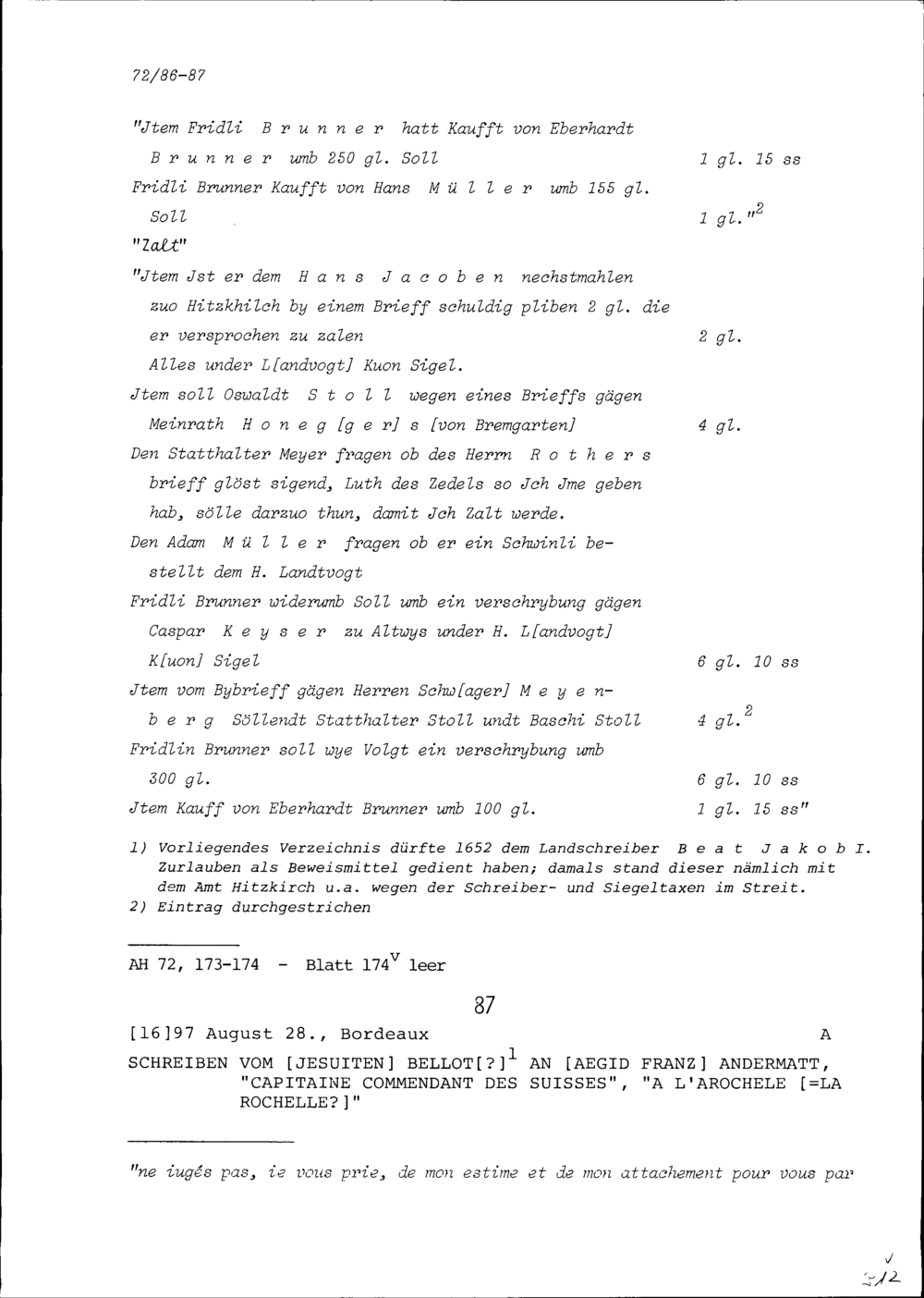 Verzeichnis der Abgaben auf verschiedenen Briefen von Dorfgenossen der Gemeinde Aesch im Amt Hitzkirch, aufgezeichnet von Beat II. Zurlauben, Landschreiber der Freien Ämter