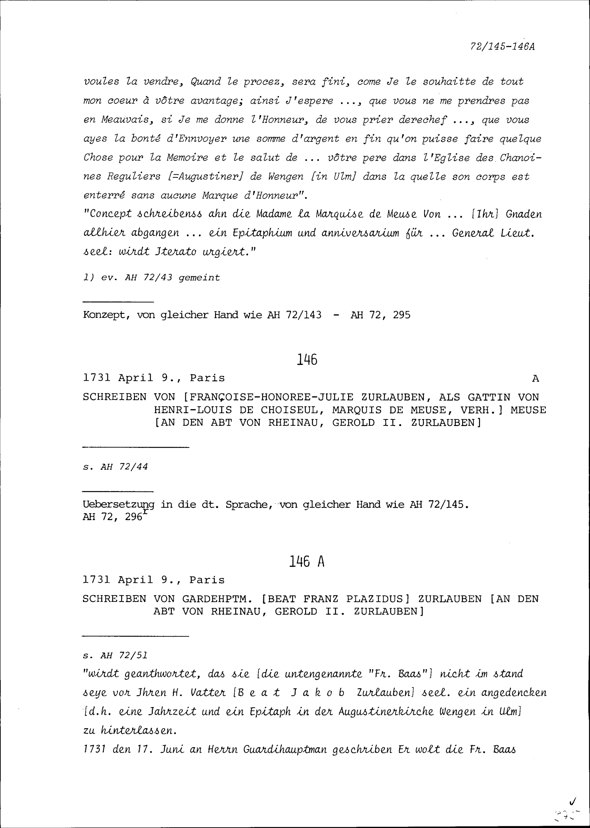 Schreiben von Gerold II. Zurlauben, Abt von Rheinau an Françoise-Honorée-Julie Zurlauben, Gattin von Henri-Louis de Choiseul, Marquis de Meuse