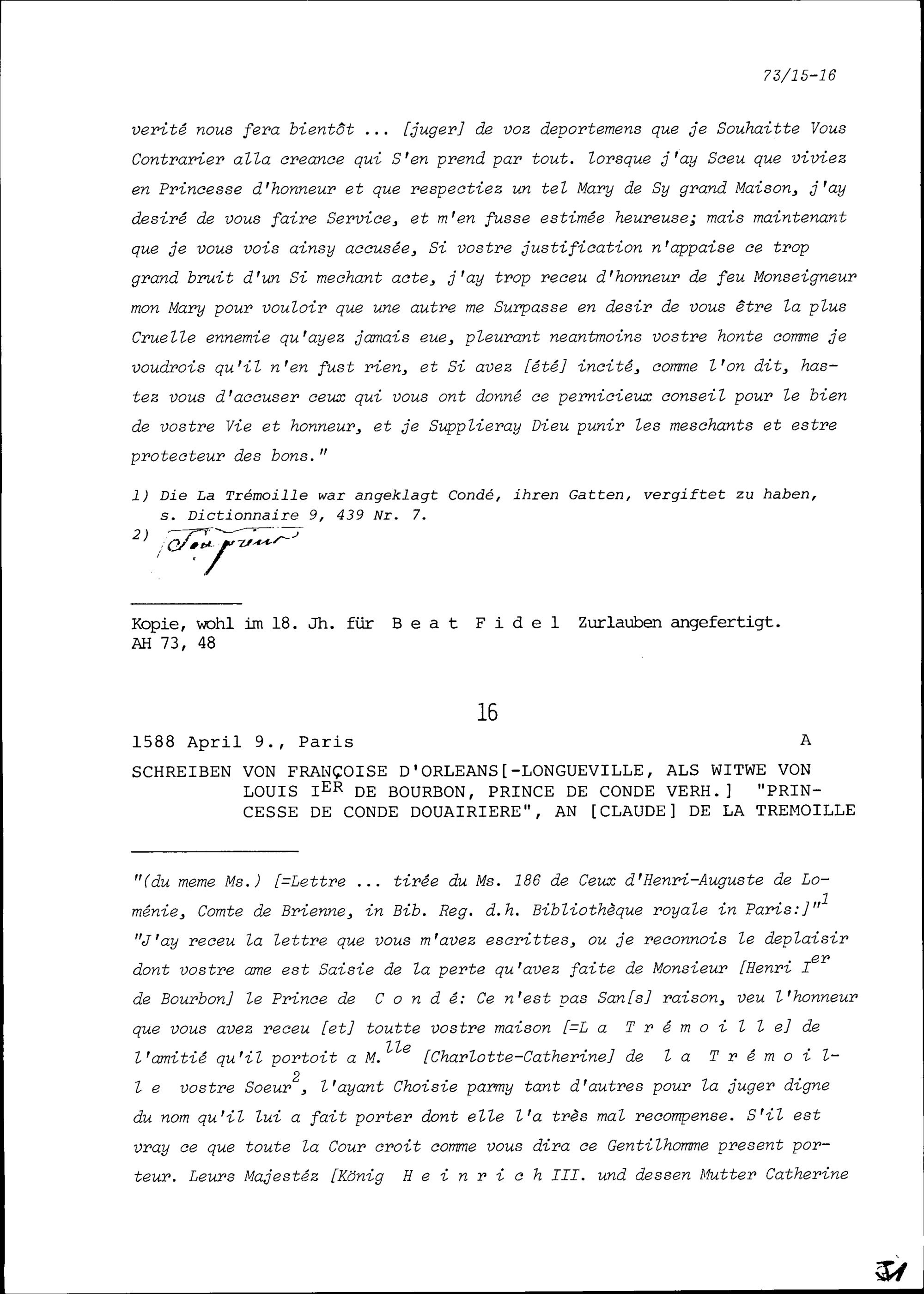 Schreiben von Françoise d'Orléans-Longueville, Witwe von Louis I. de Bourbon, an Charlotte-Cathérine de la Trémoille, Witwe von Henri I. de Bourbon
