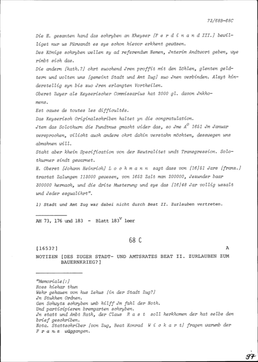 Notiz von Beat II. Zurlauben, Stadt- und Amtrat Zug, zur Jahrrechnung vom 10. August 1653 in Baden