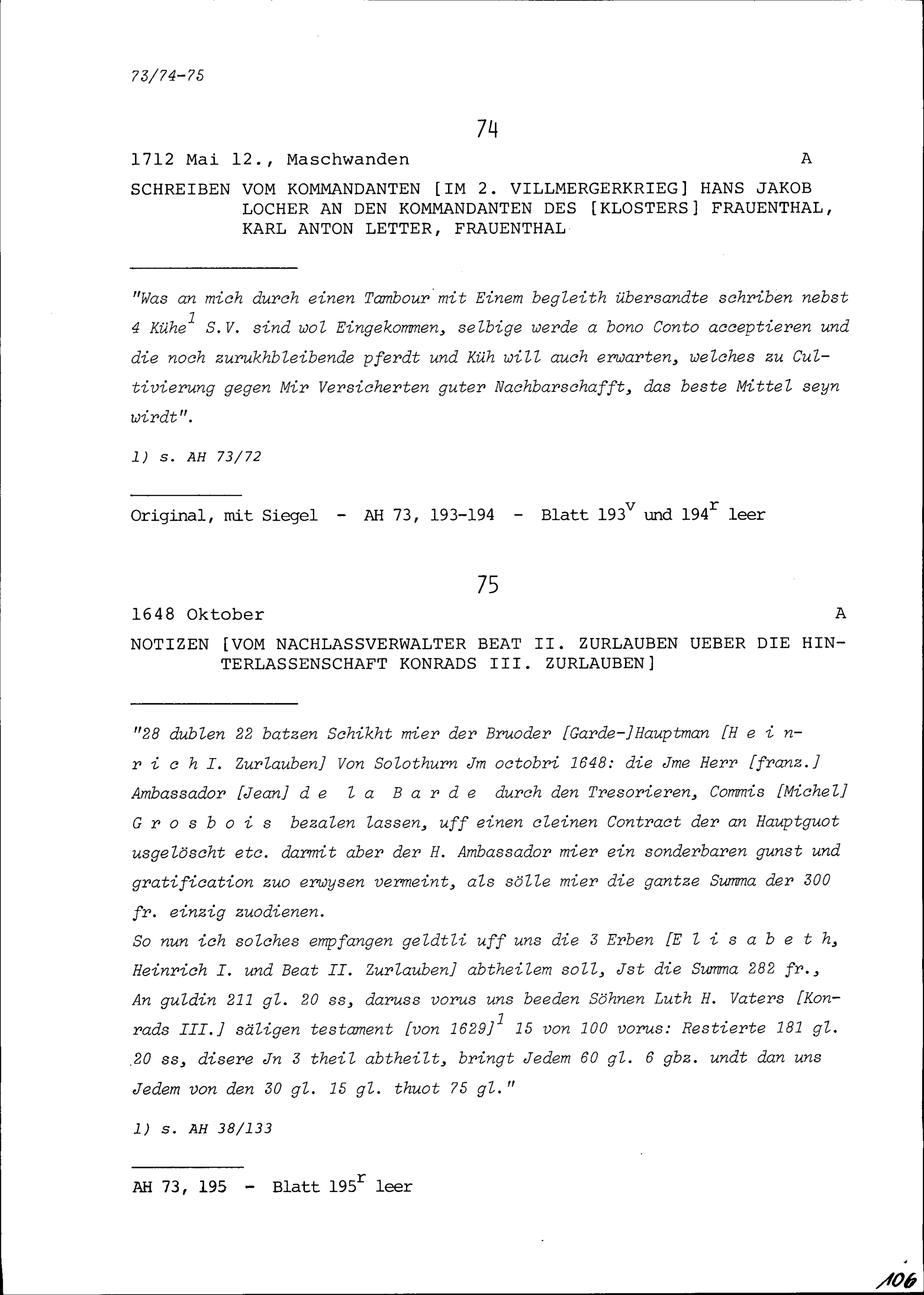 Notiz von Beat II. Zurlauben, Nachlassverwalter, über die Hinterlassenschaft von Konrad III. Zurlauben
