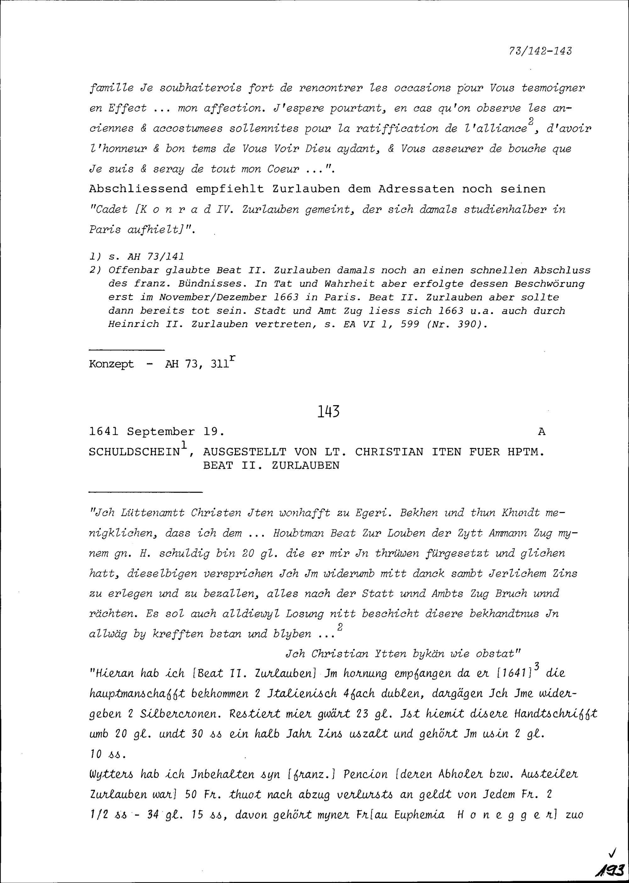 Schreiben von Beat II. Zurlauben, Stadt- und Amtrat, an Barthélémy Rolland, Dolmetscher von Frankreich