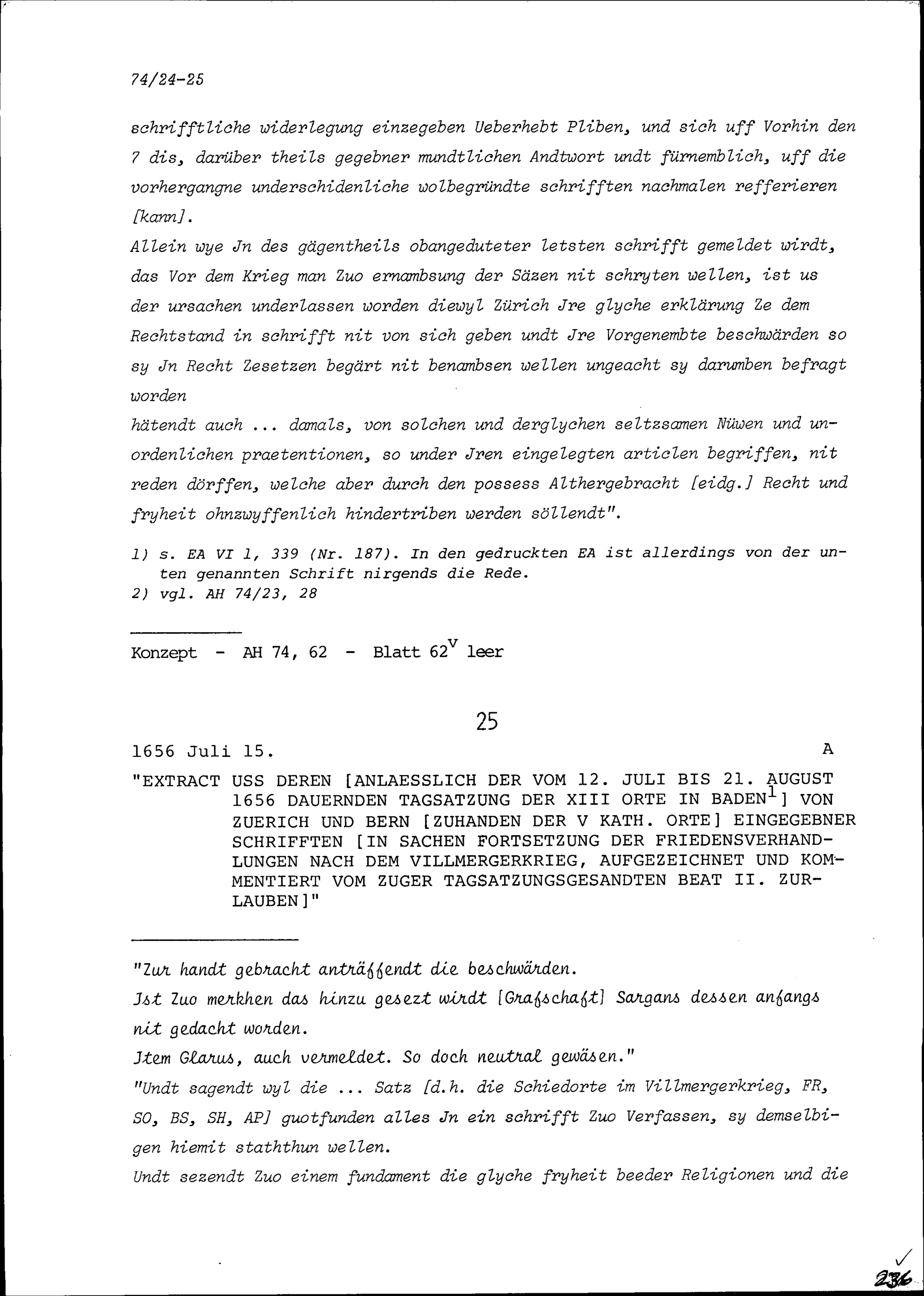 Schriften in Sachen Fortsetzung der Friedensverhandlungen nach dem Ersten Villmergerkrieg, mit ausführlicher Antwort von Beat II. Zurlauben, Zuger Tagsatzungsgesandter