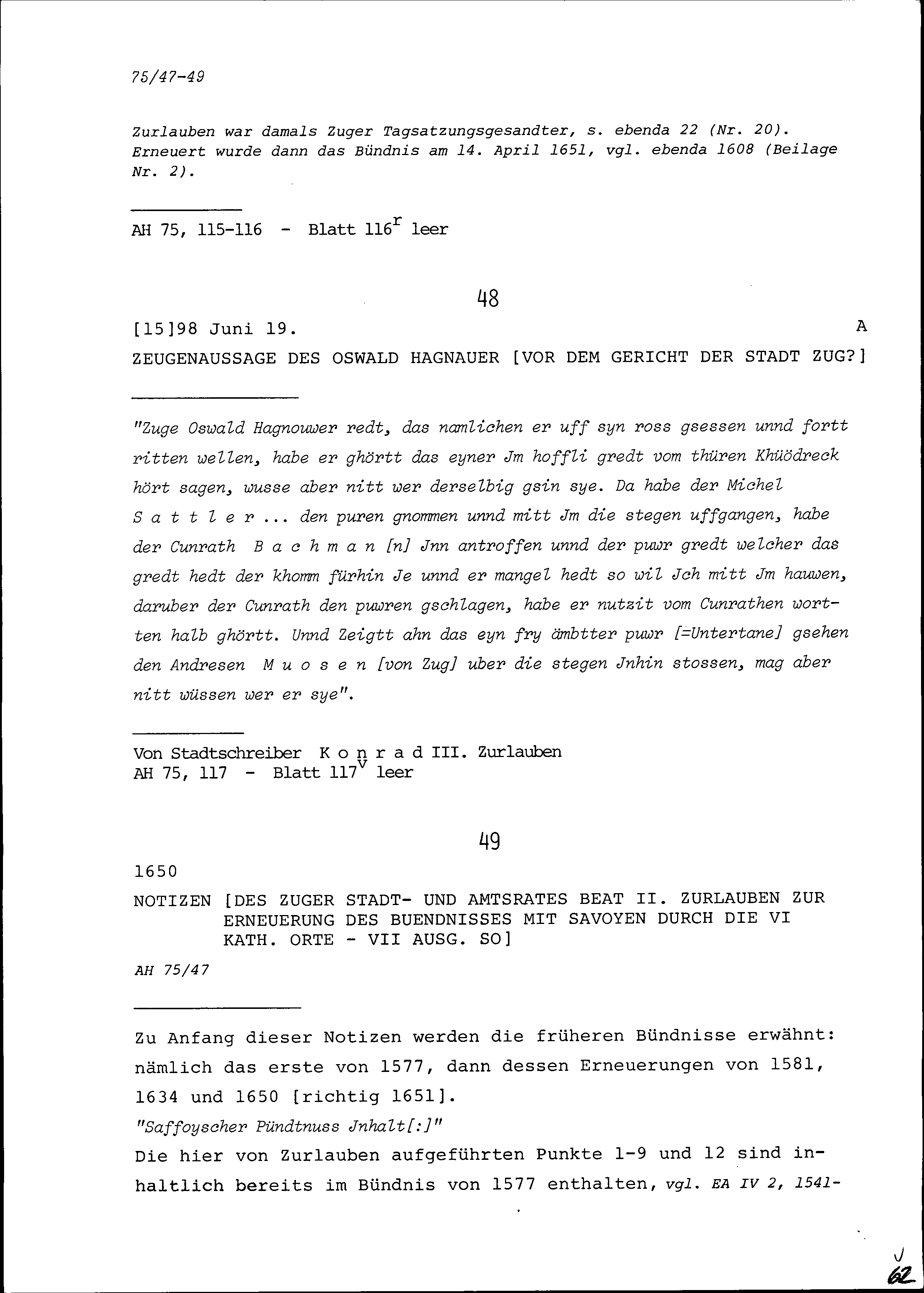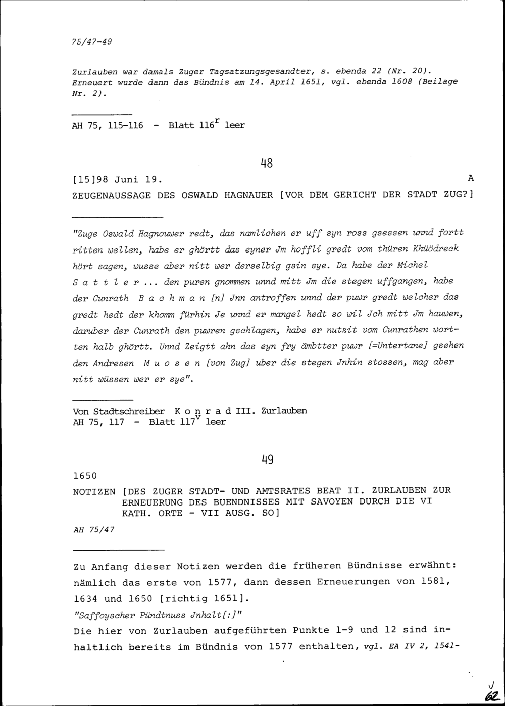 Notiz von Beat II. Zurlauben, Stadt- und Amtrat Zug, zur Erneuerung des Bündnisses mit Savoyen durch die Sechs Katholischen Orte