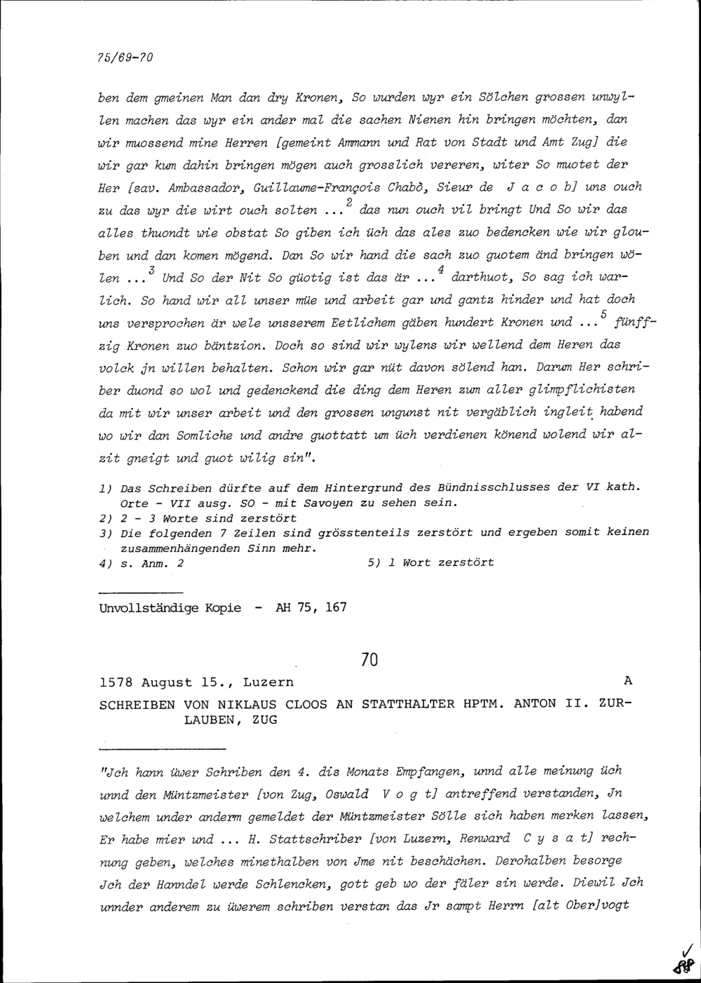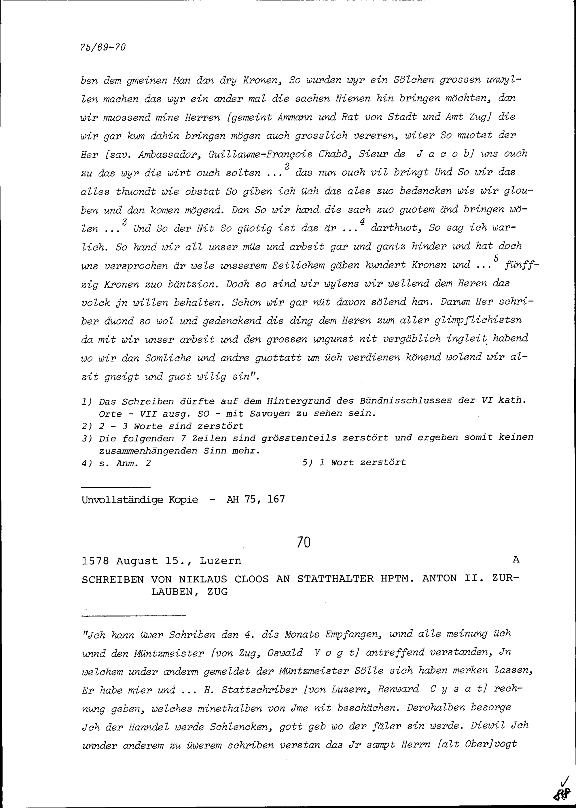 Schreiben von Anton II. Zurlauben, Statthalter Zug, an Renward Cysat, Luzerner S...