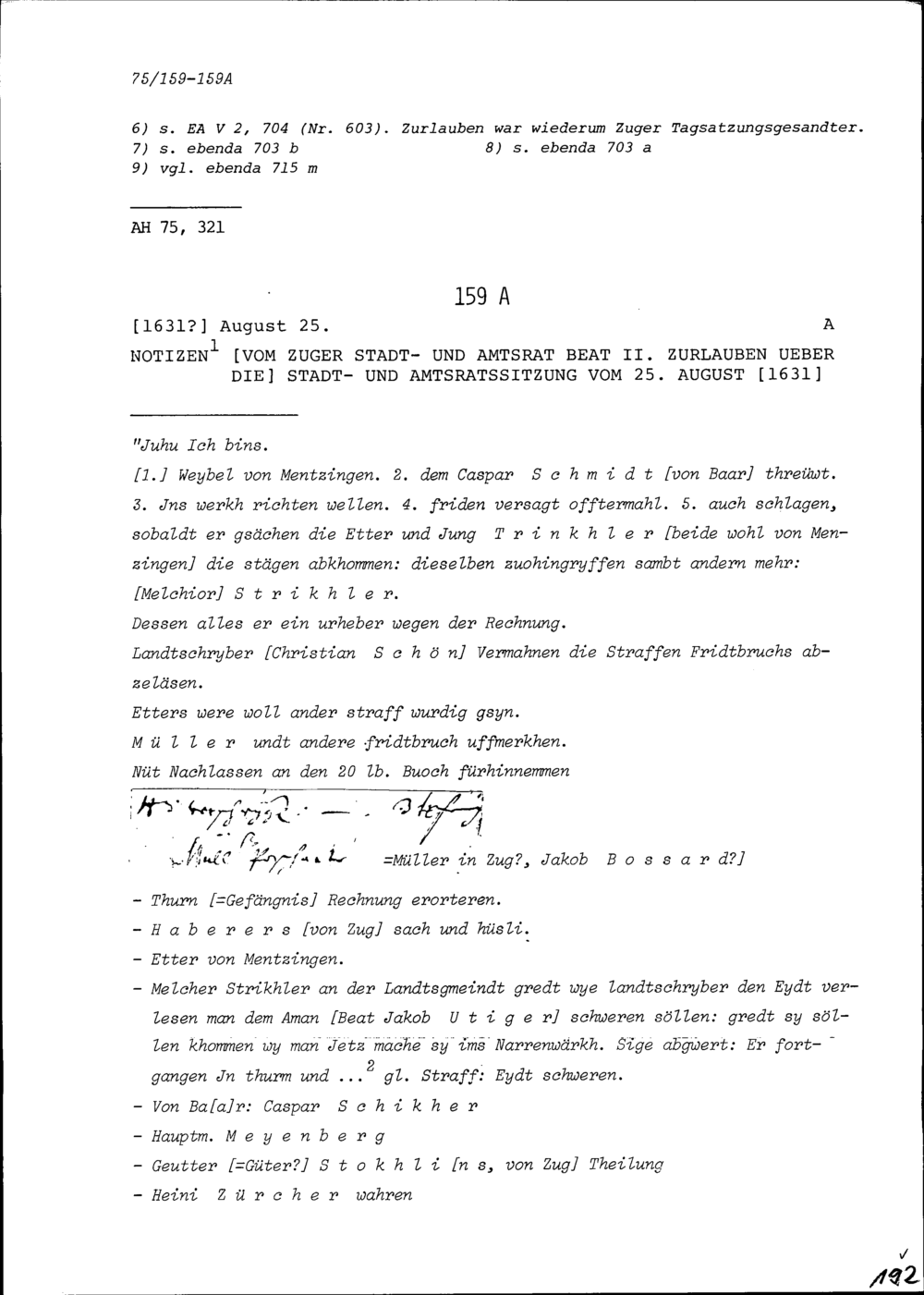 Notiz von Beat II. Zurlauben, Zuger Tagsatzungsgesandter, über die Tagsatzung der Elf Orte in Baden vom 1. August 1632 sowie die Schiedsverhandlungen vom 3. August bis 7. September 1632 betreffend Matrimonial- und Kollaturstreit im Thurgau und Rheintal