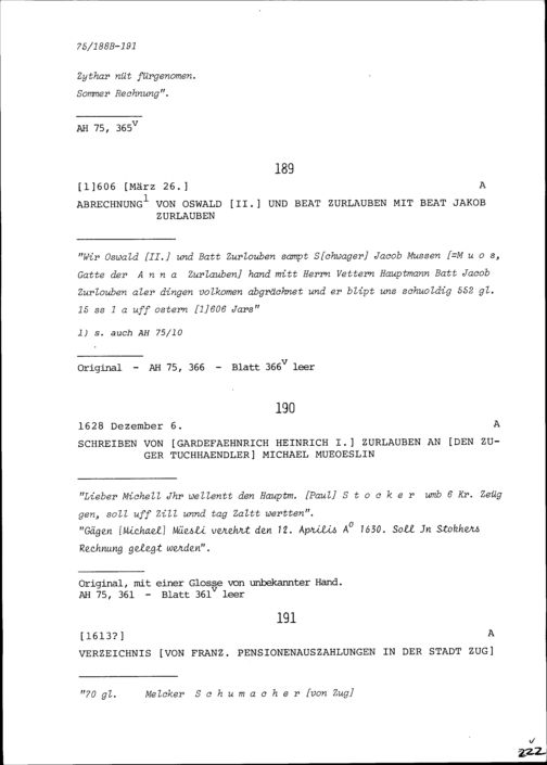 Verzeichnis von französischen Pensionenauszahlungen in der Stadt Zug