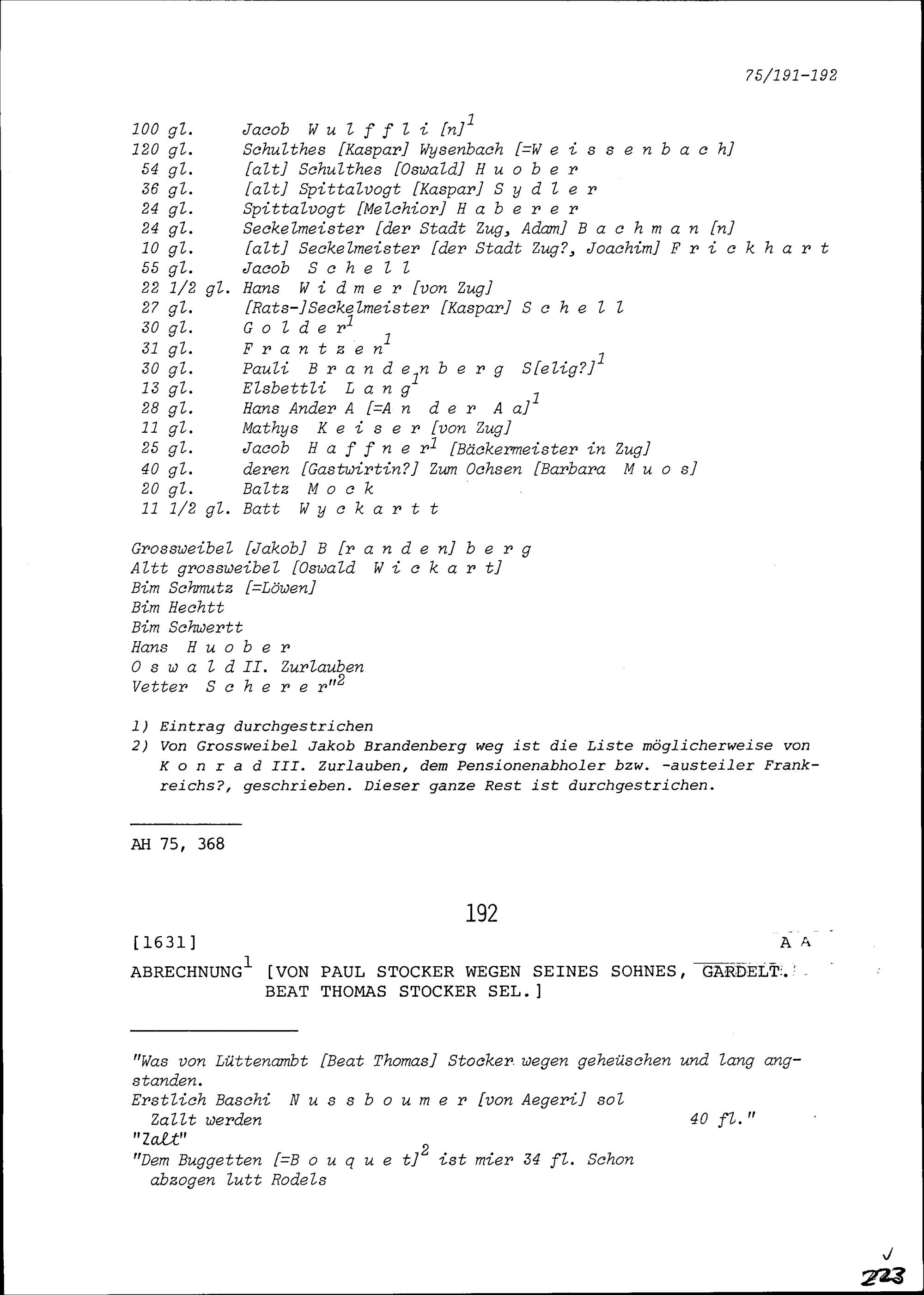 Verzeichnis von französischen Pensionenauszahlungen in der Stadt Zug