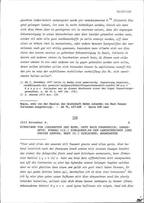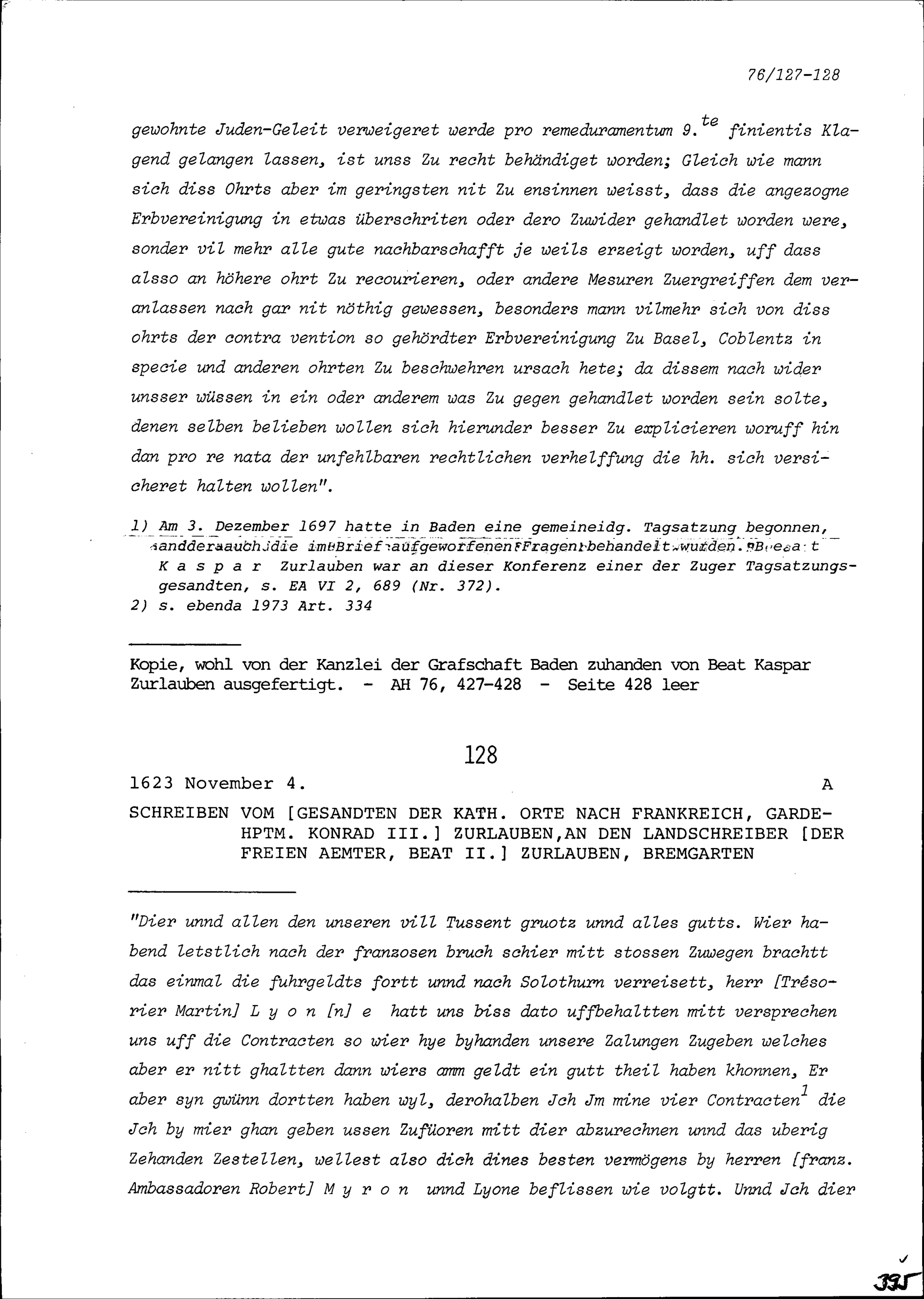 Schreiben des Statthalters, Regenten und der Kammerräte von Vorderösterreich an die in der Grafschaft Baden regierenden Orte