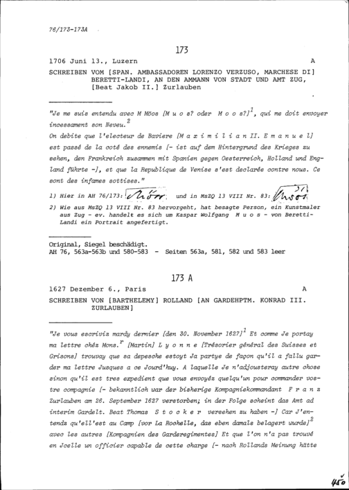Schreiben von Barthélémy Rolland an Konrad III. Zurlauben, Gardehauptmann