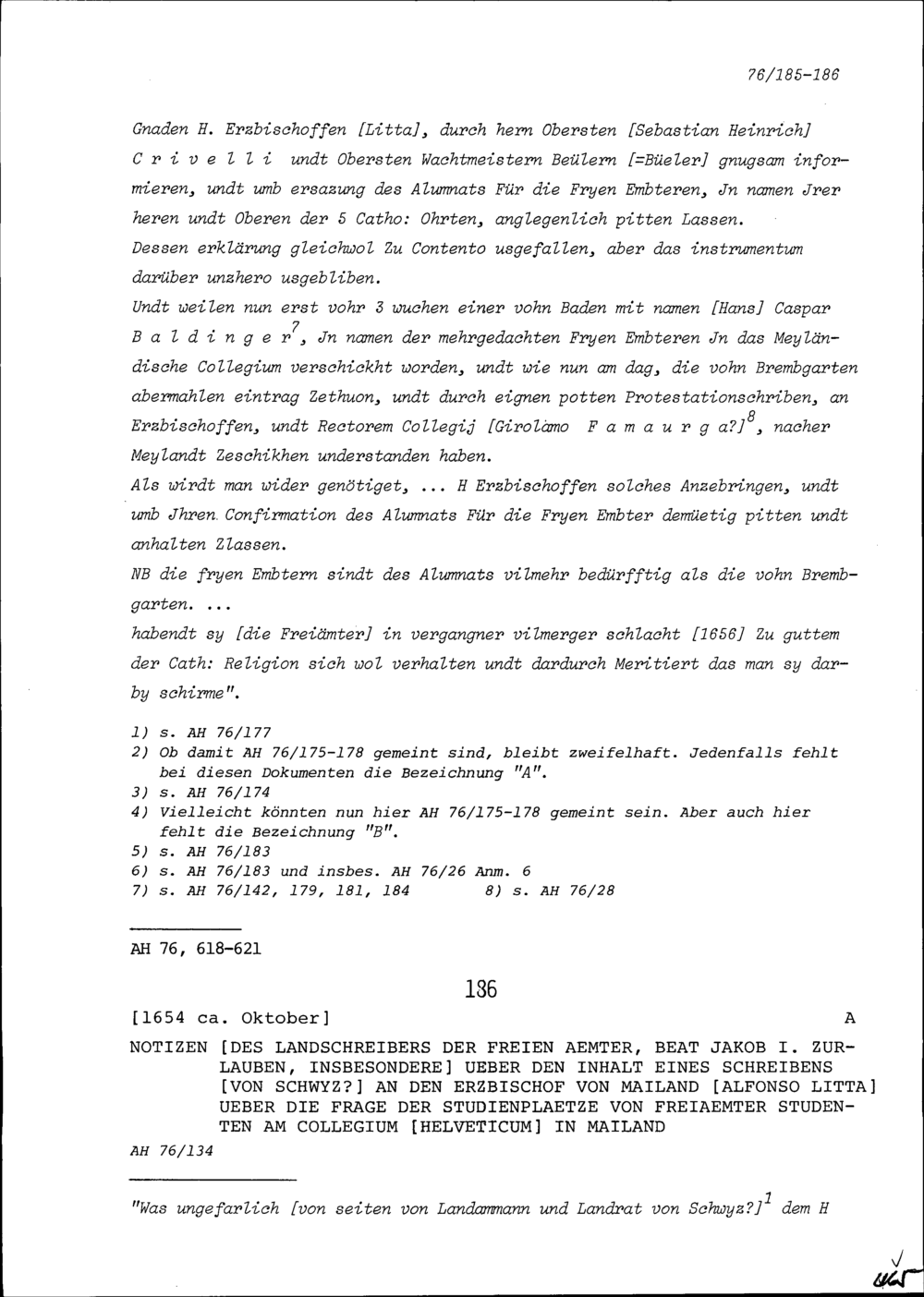 Bericht betreffend der den Freien Ämter zustehenden Studienplätzen am Kollegium Helveticum in Mailand für Alfonso Litta, Erzbischof von Mailand, verfasst von Beat Jakob I. Zurlauben, Landschreiber