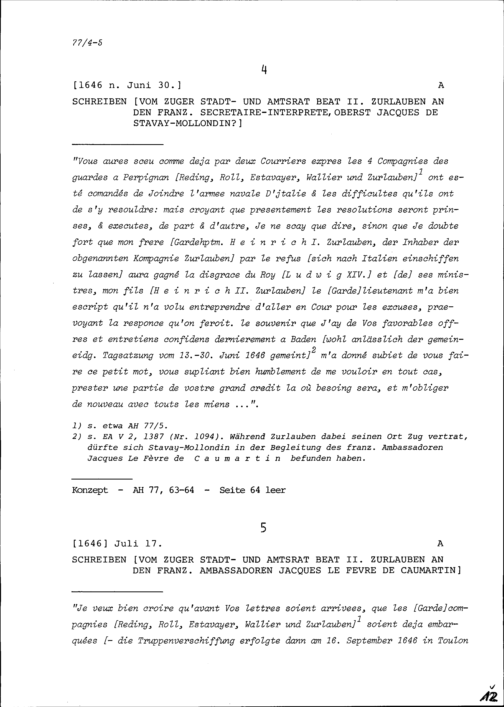 Schreiben von Beat II. Zurlauben, Stadt- und Amtrat Zug, an Jacques Le Fèvre de Caumartin, Ambassador von Frankreich