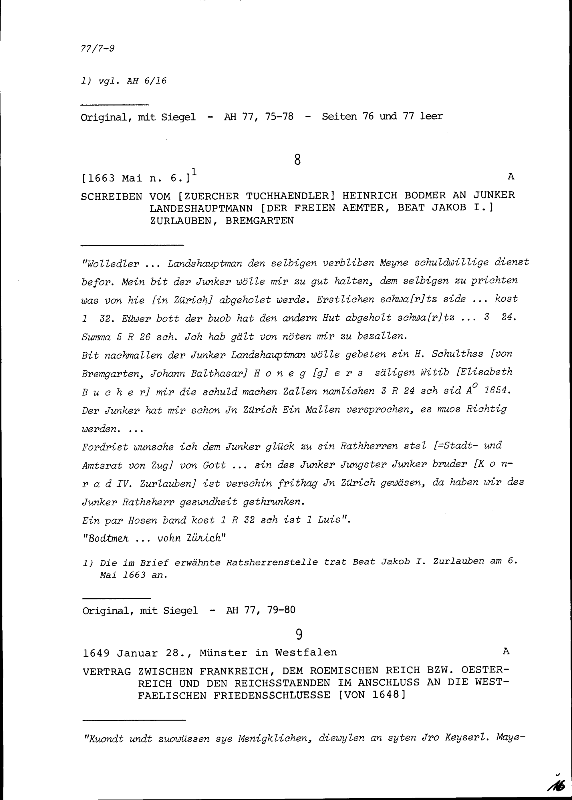 Schreiben von Arbogast Felber, Kanzler der Abtei Muri, an Jakob Wirz, Landvogt, und an Beat Jakob I. Zurlauben, Landschreiber, Bremgarten