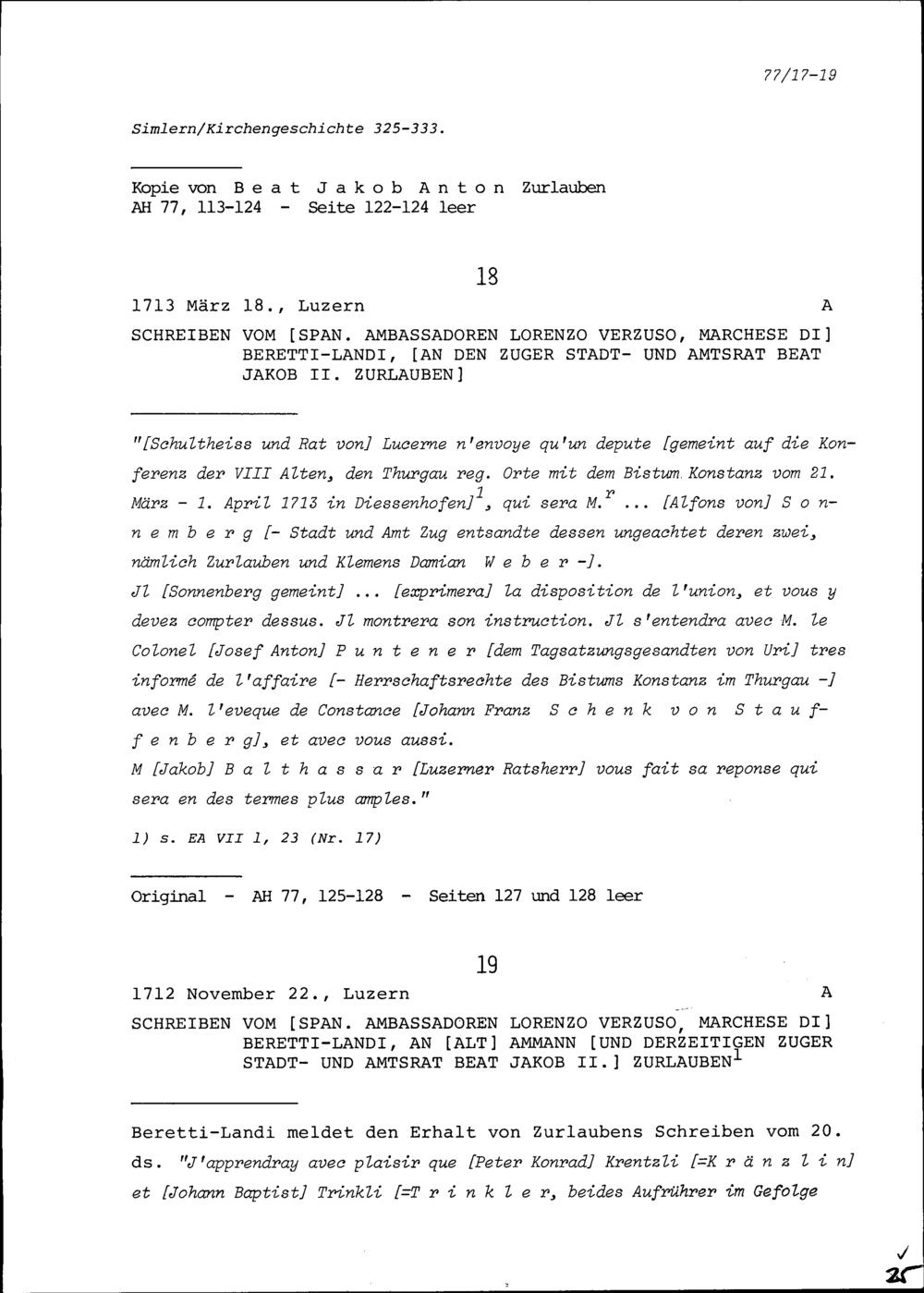 Schreiben von Lorenzo Verzuso, Marchese di Beretti-Landi, Ambassador von Spanien, an Beat Jakob II. Zurlauben, Altammann und Stadt- und Amtrat Zug