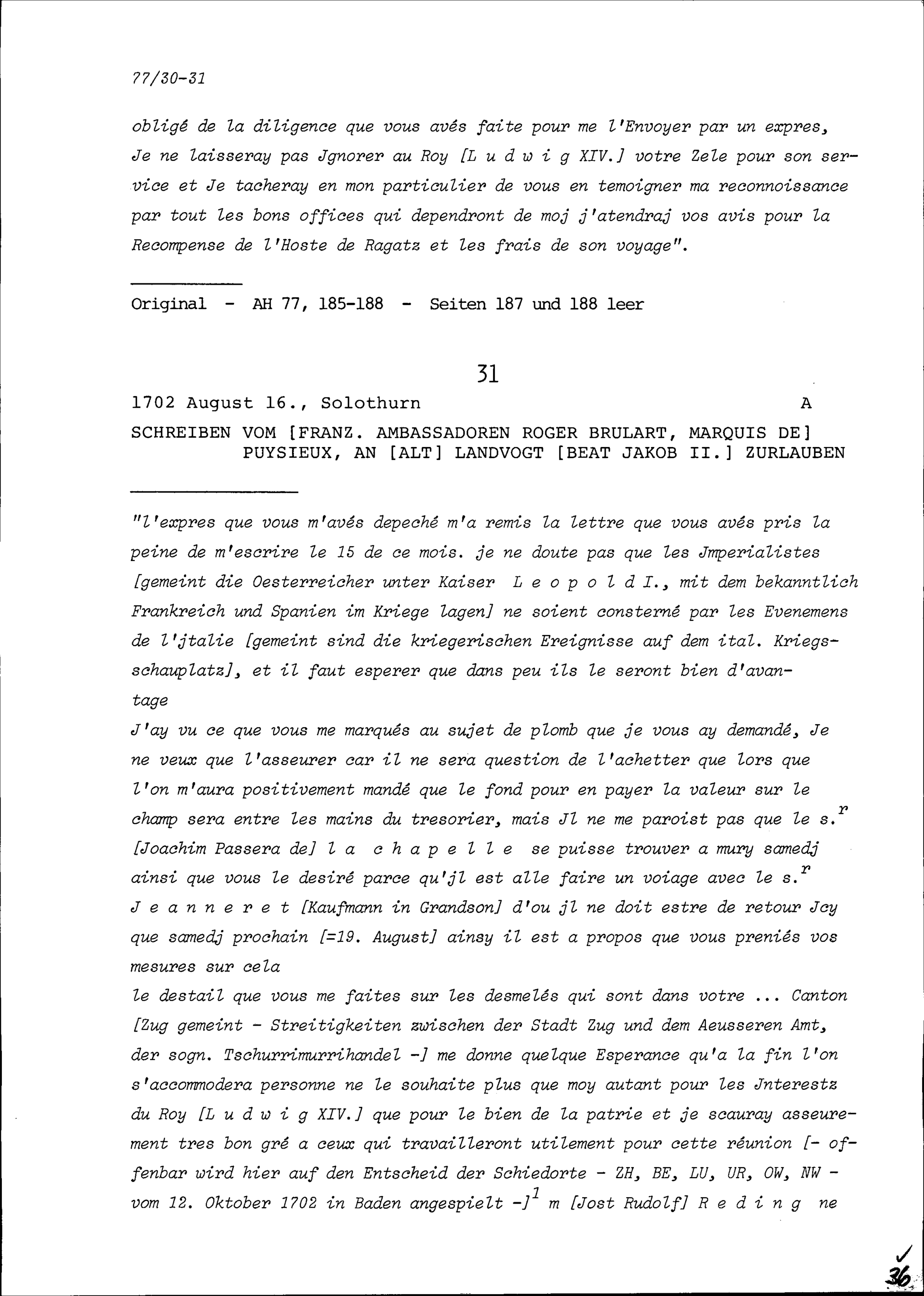 Schreiben von Roger Brûlart, Marquis de Puysieux, Ambassador von Frankreich, an Beat Jakob II. Zurlauben, Landvogt der Freien Ämter