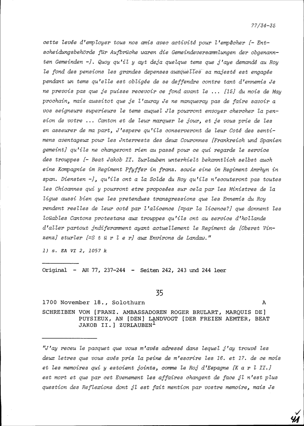 Schreiben von Roger Brûlart, Marquis de Puysieux, Ambassador von Frankreich, an Beat...