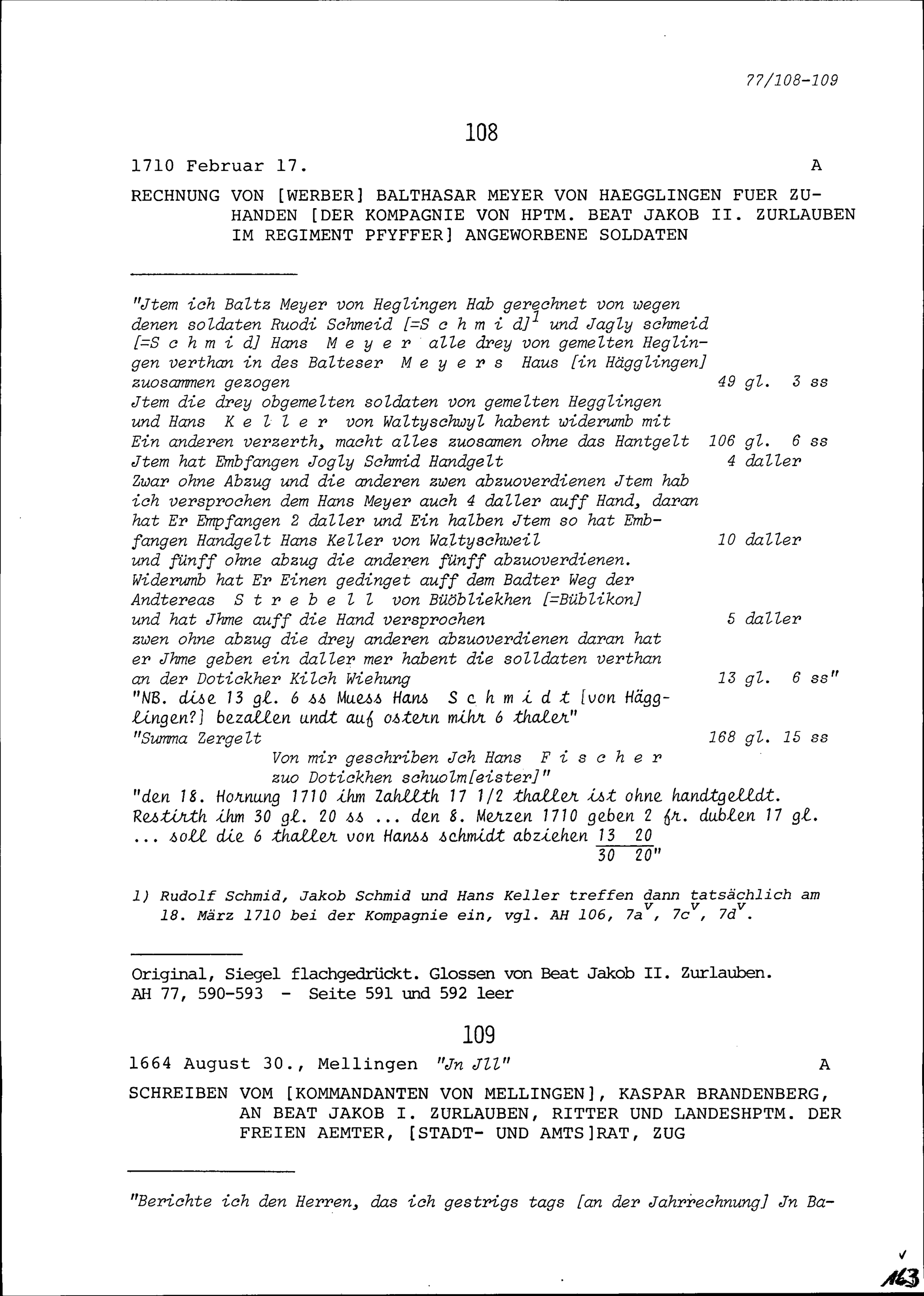 Schreiben von Kaspar Brandenberg, Kommandant von Mellingen, an Beat Jakob I. Zurlauben, Landeshauptmann der Freien Ämter, Stadt- und Amtrat, Zug