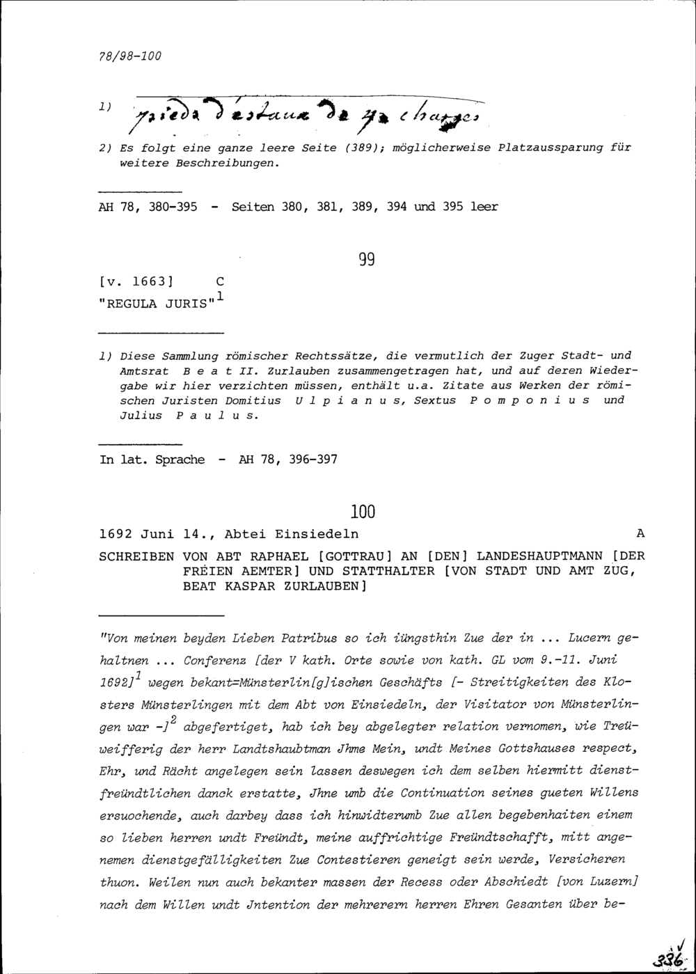 Schreiben von Raphael Gottrau, Abt, an Beat Kaspar Zurlauben, Landeshauptmann der...