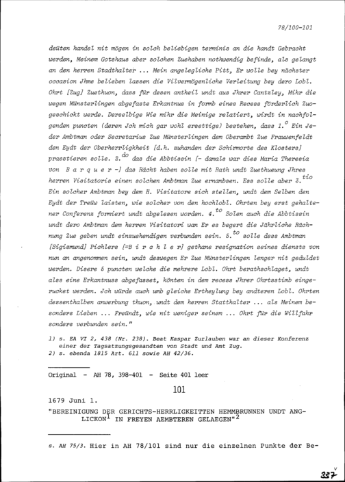 Schreiben von Raphael Gottrau, Abt, an Beat Kaspar Zurlauben, Landeshauptmann der Freien Ämter und Statthalter von Stadt und Amt Zug