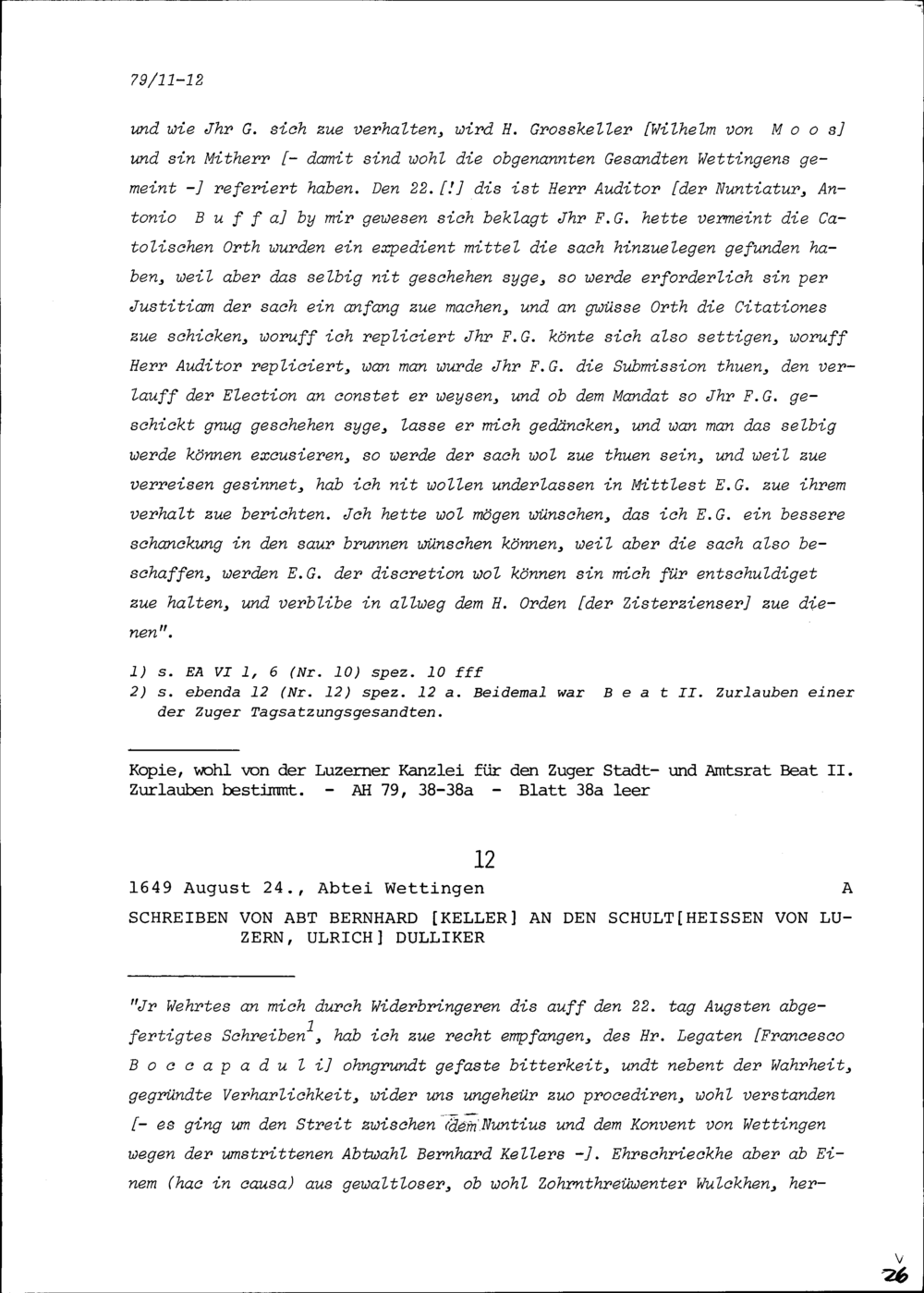 Schreiben von Ulrich Dulliker, Schultheiss, an Bernhard Keller, Abt von Wettinge...
