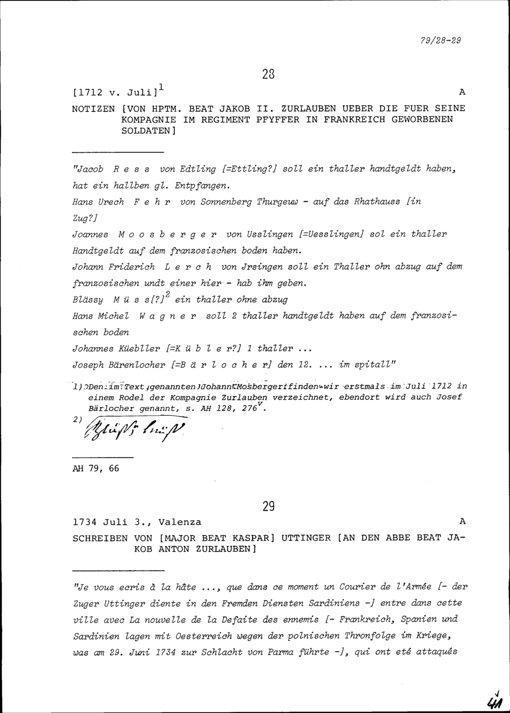 Schreiben von Beat Kaspar Uttinger, Major in sardischen Diensten, an Beat Jakob Anton Zurlauben, Priester