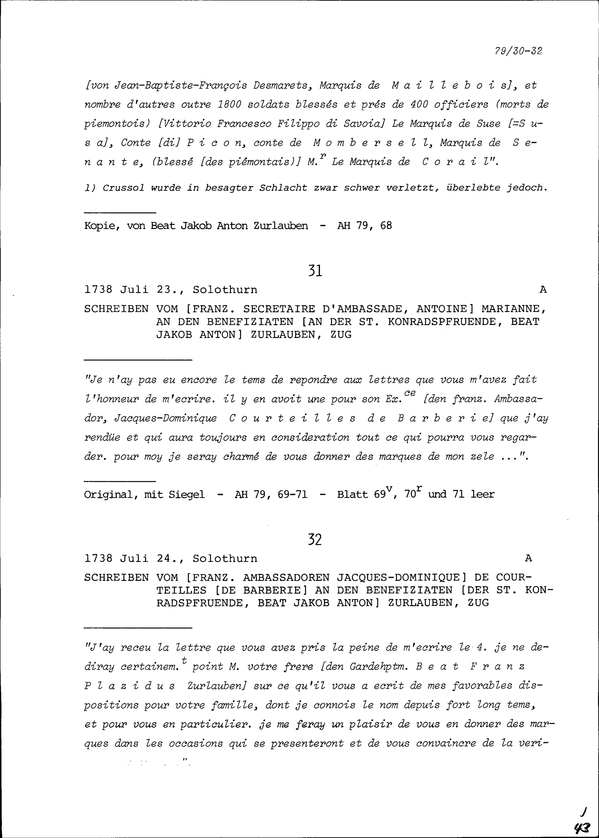 Schreiben von Jacques-Dominique de Courteilles de Barberie, Ambassador von Frankreich, an Beat Jakob Anton Zurlauben, Priester und Benefiziat der Sankt Konradspfrund, Zug