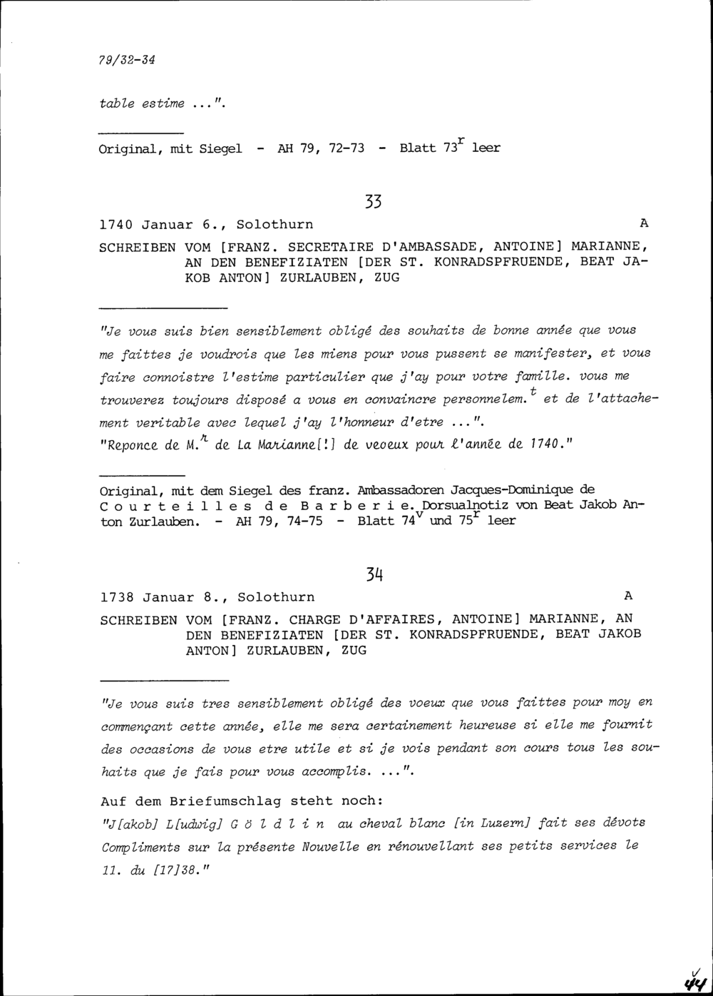 Schreiben von Jacques-Dominique de Courteilles de Barberie, Ambassador von Frankreich, an Beat Jakob Anton Zurlauben, Priester und Benefiziat der Sankt Konradspfrund, Zug