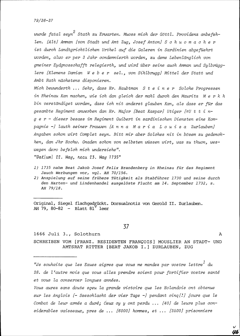 Schreiben von Jakob Bernhard Brandenberg, Stabführer der Stadt Zug, an Gerold II. Zurlauben, Abt und Herrn von Rheinau, Rheinau