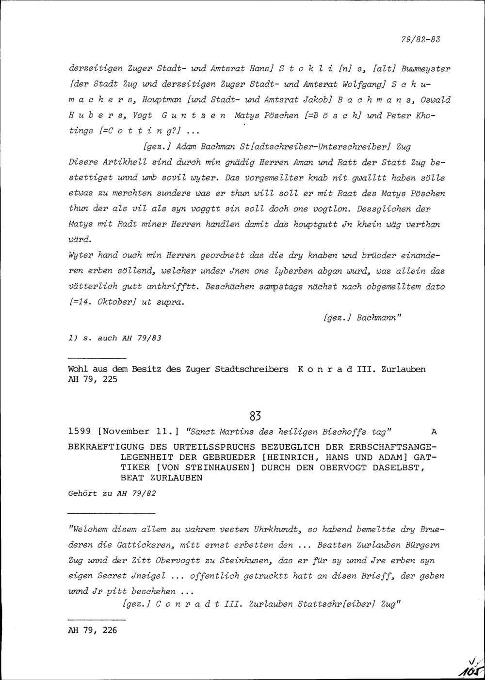 Urteil in der Erbschaftsangelegenheit der Gebrüder Heinrich Gattiker, Hans Gattiker und Adam Gattiker von Steinhausen, aufgezeichnet von Adam Bachmann, Unterschreiber,