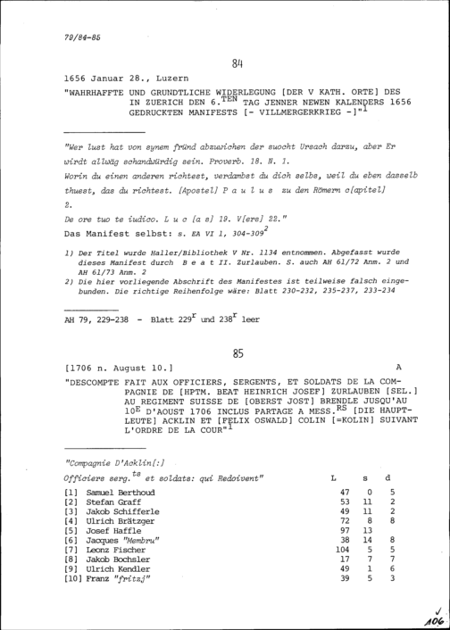 Abrechnung der Offiziere, Sergeanten und Soldaten der Kompanie von Beat Heinrich Josef Zurlauben, Hauptmann, selig, im Schweizer Regiment von Jost Brendlé, Oberst, bis 10. August 1706 und Aufteilung zwischen NN Acklin, Hauptmann, und Felix Oswald Kolin, Hauptmann