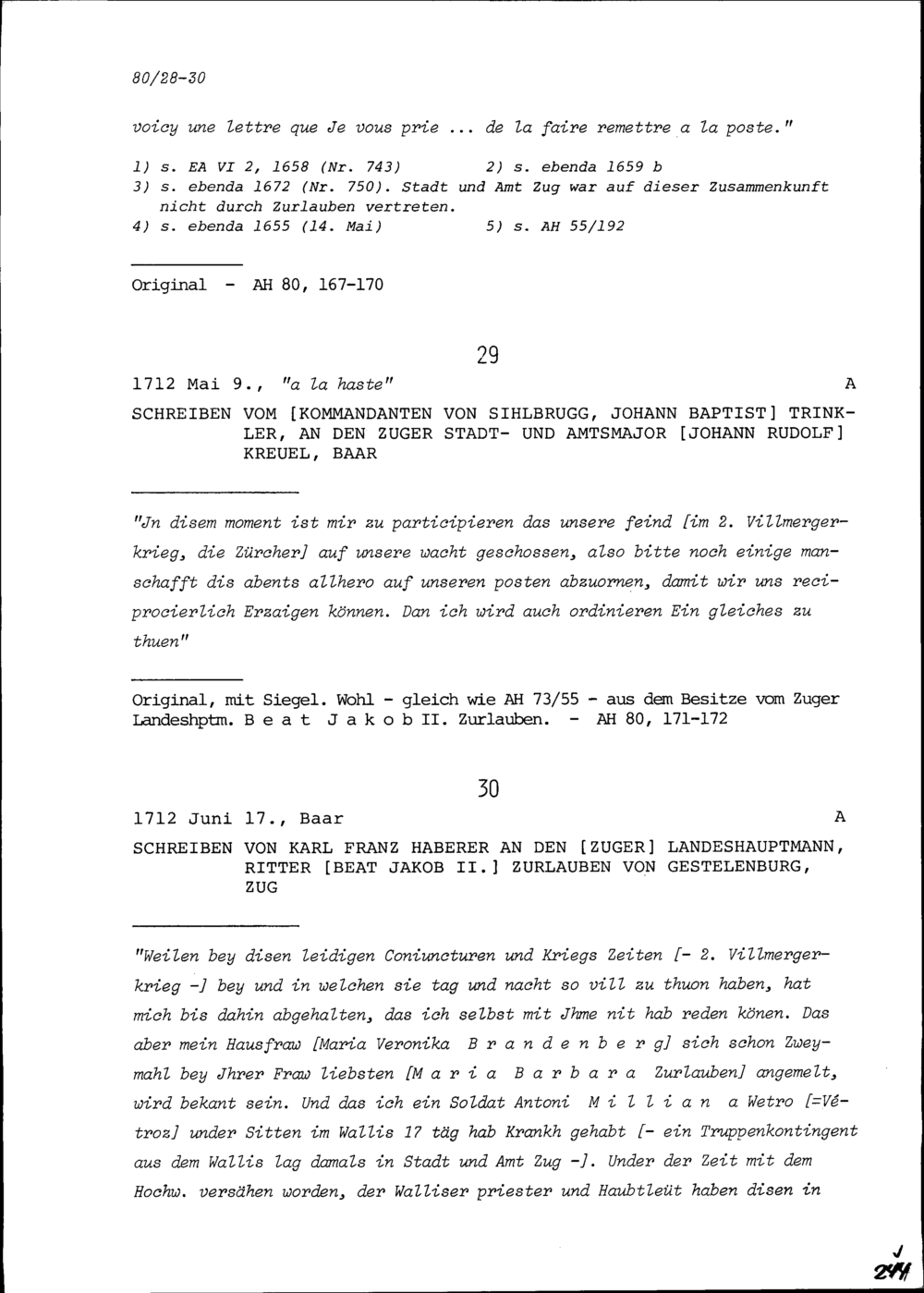 Schreiben von Laurent Corentin de la Martinière, Dolmetscher von Frankreich, an Beat Jakob II. Zurlauben, Zuger Landeshauptmann