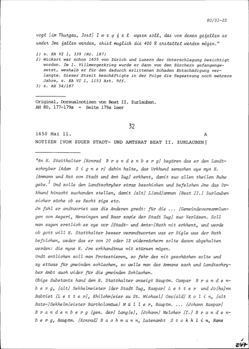 Schreiben von Jakob Wickart, Altlandvogt im Thurgau, an Beat II. Zurlauben, Altammann und Zuger Gesandter an der Tagsatzung der Dreizehn Orte in Baden
