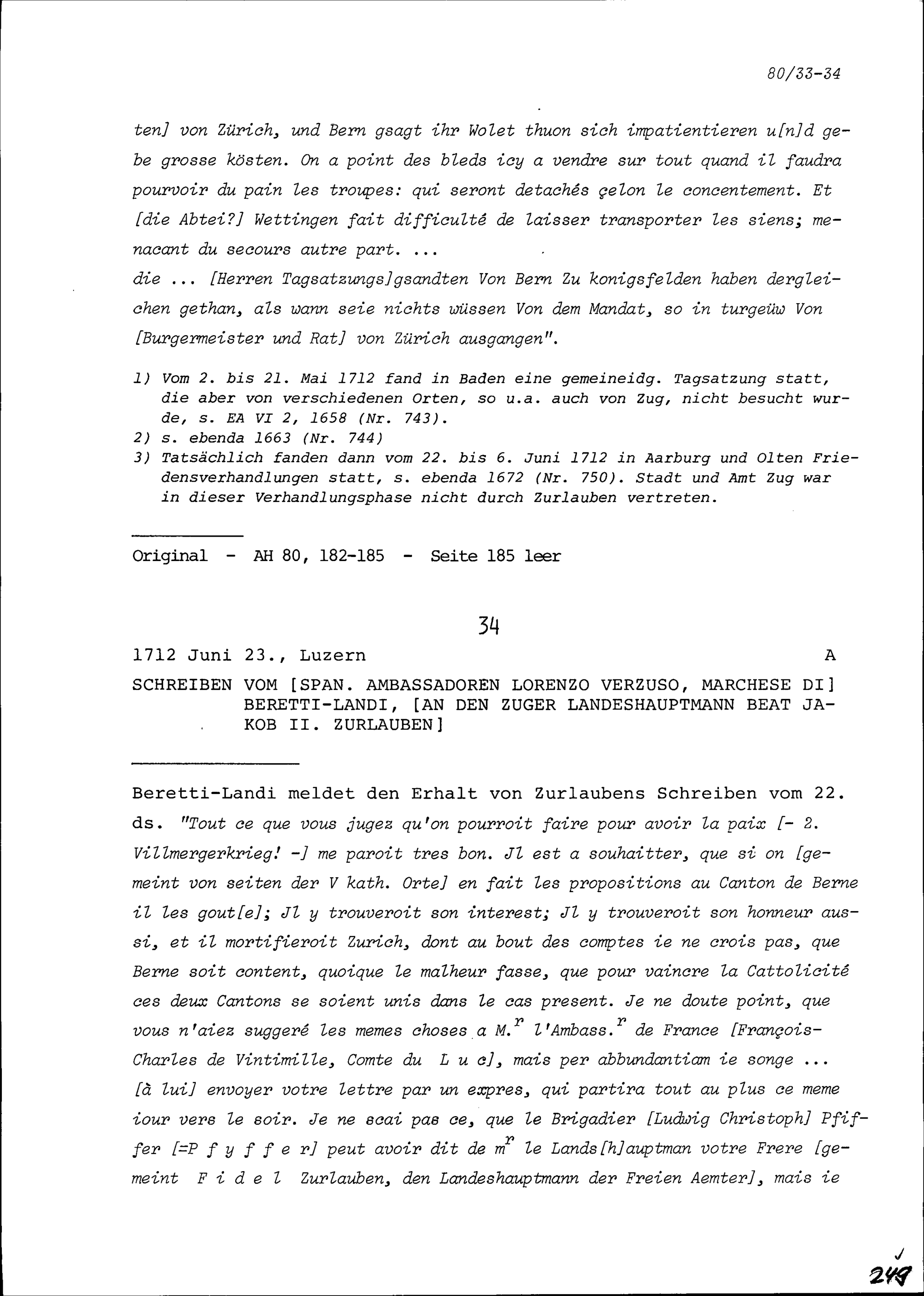 Schreiben von Jost Anton Schmid, Urner Tagsatzungsgesandter, an Beat Jakob II. Zurlauben, Zuger Landeshauptmann