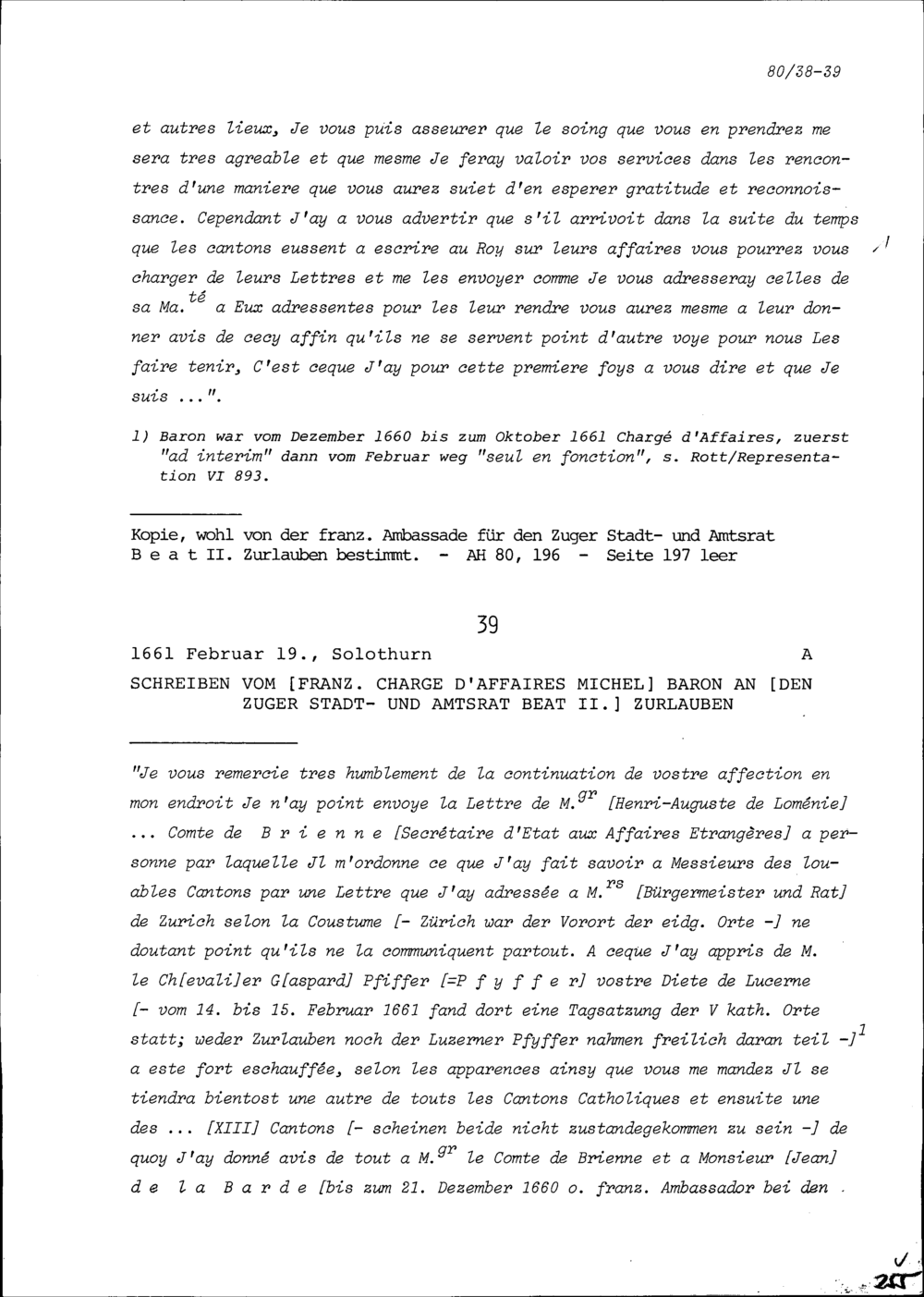 Schreiben von Henri-Auguste de Loménie, Comte de Brienne, französischer Geschäftsträger für Auswärtiges an Michel Baron, französischer Dolmetscher