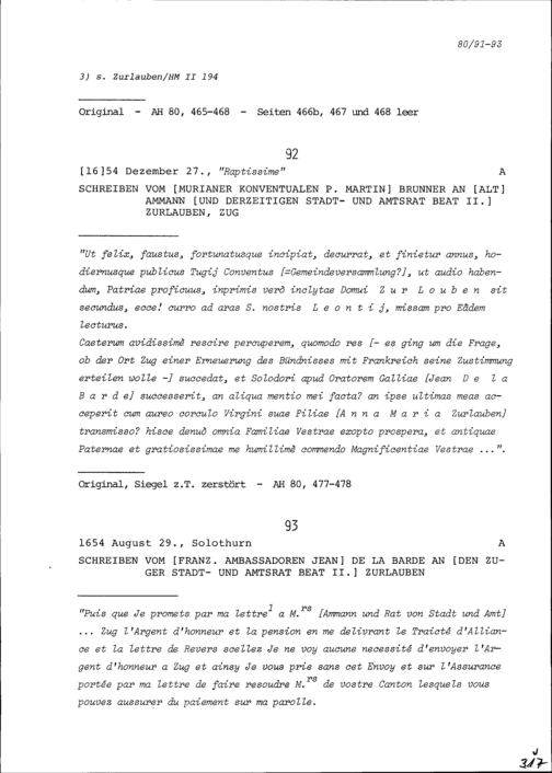 Schreiben von Jean de la Barde, Ambassador von Frankreich, an Beat II. Zurlauben,...
