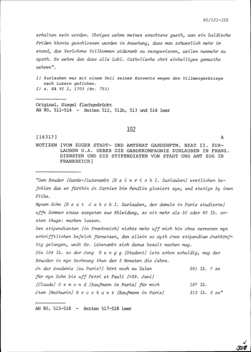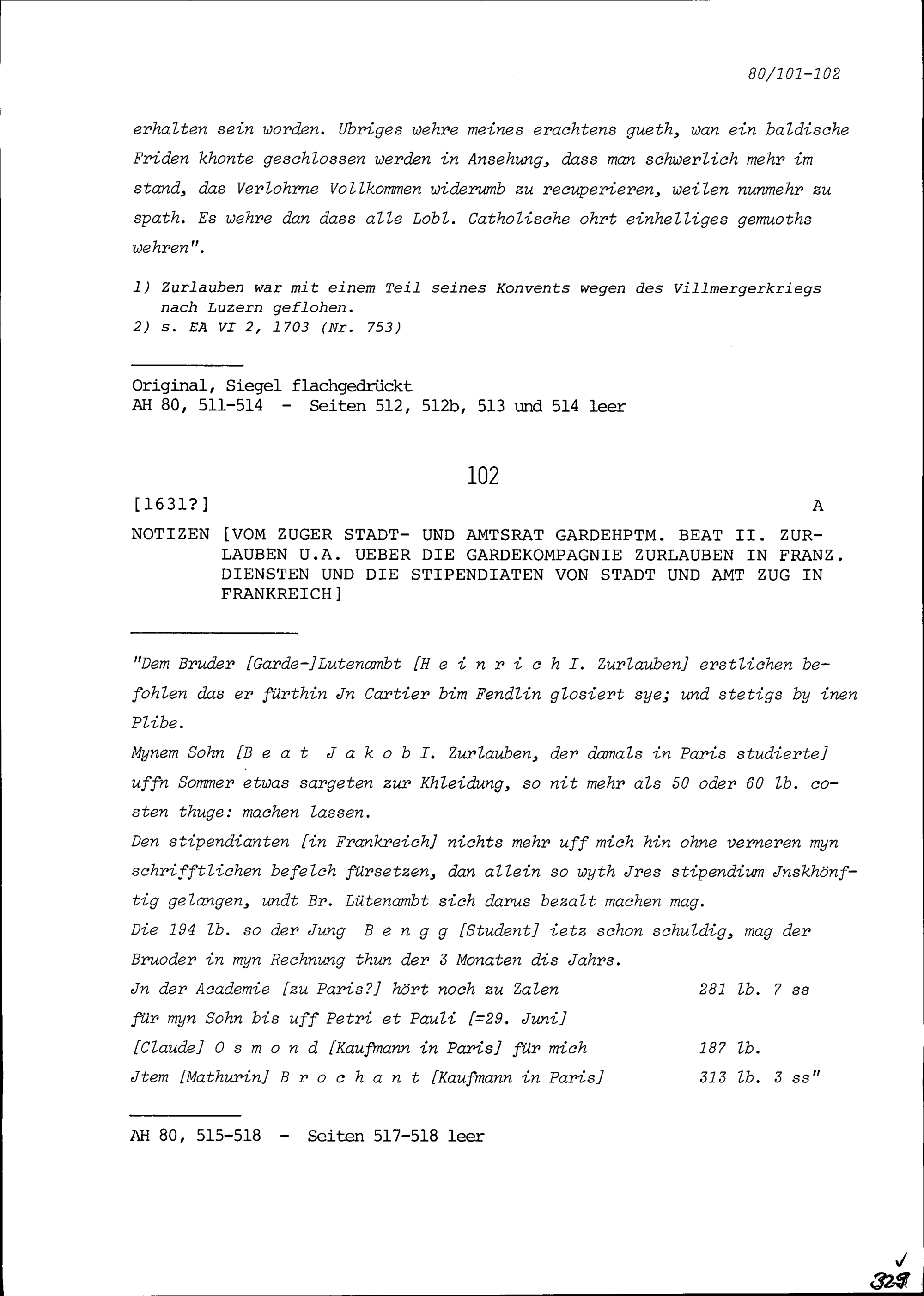 Schreiben von Plazidus Zurlauben, Abt von Muri, an Beat Jakob II. Zurlauben, Altammann und Landeshauptmann, Zug