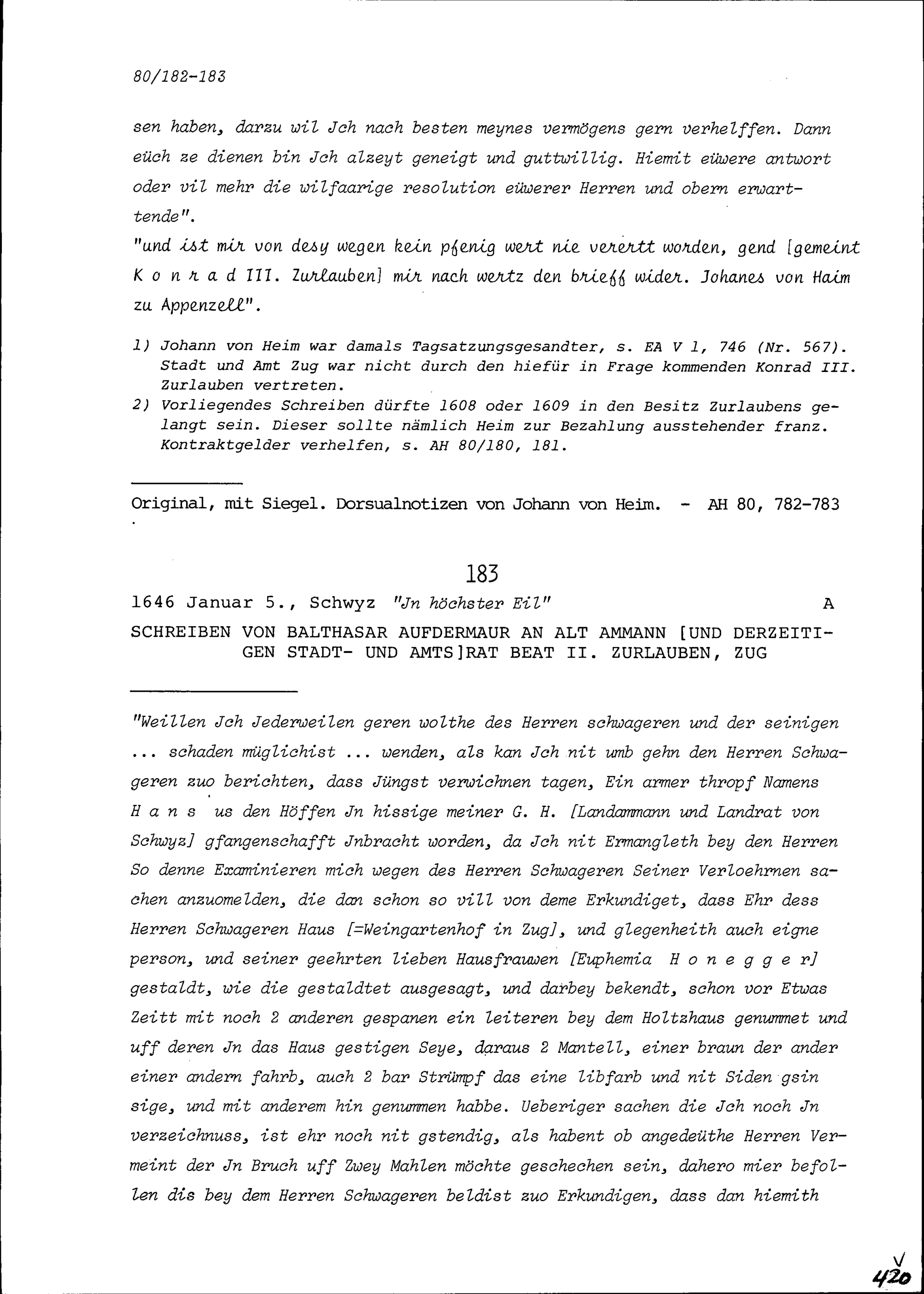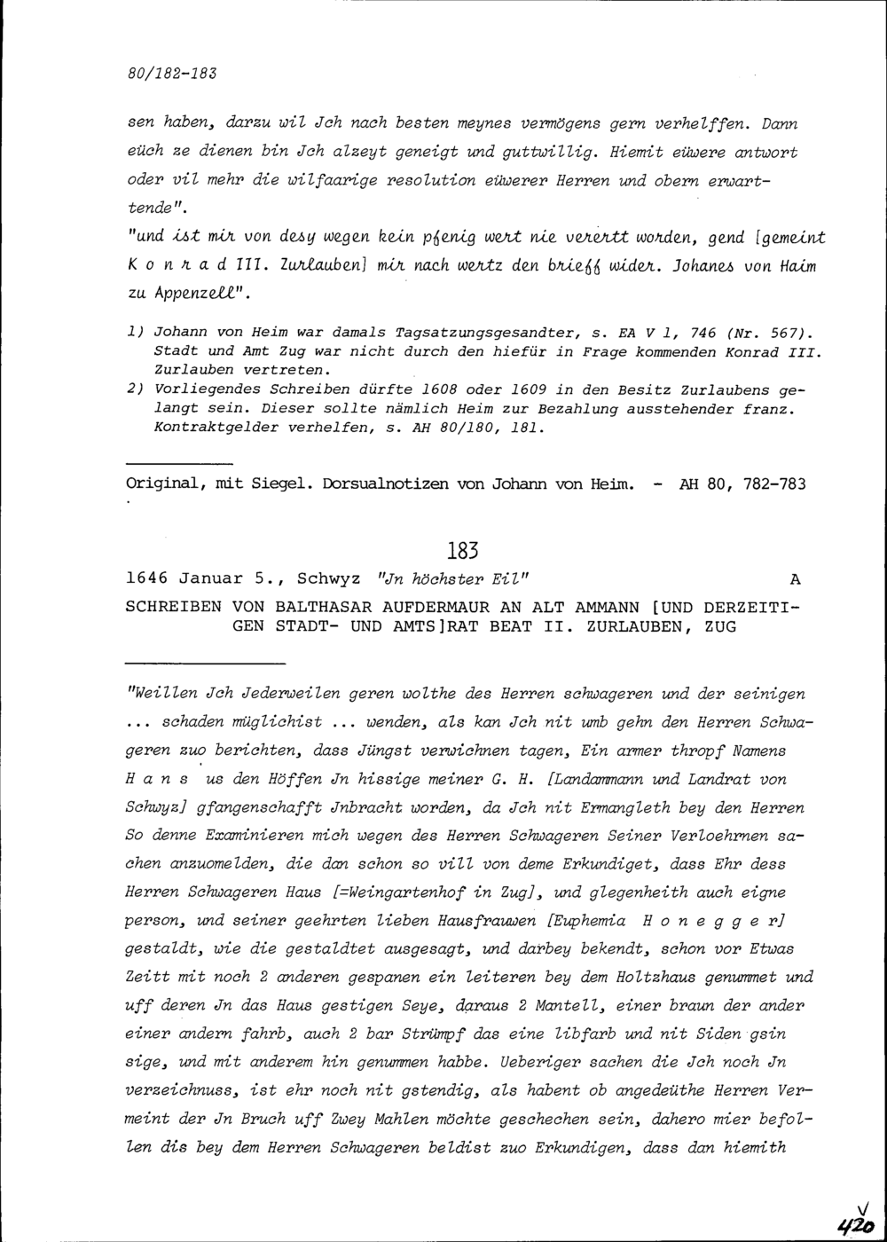 Schreiben von Jean Vigier, französischer Dolmetscher, an Johann von Heim, Landammann...