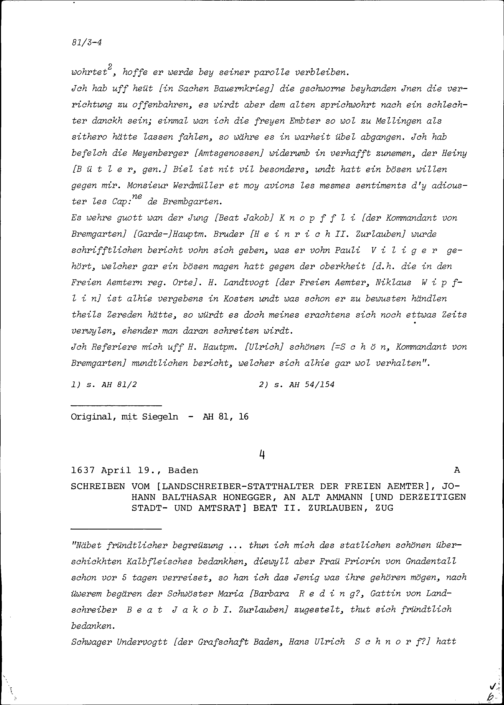 Schreiben von Beat Jakob I. Zurlauben, Landschreiber der Freien Ämter, an Beat II....