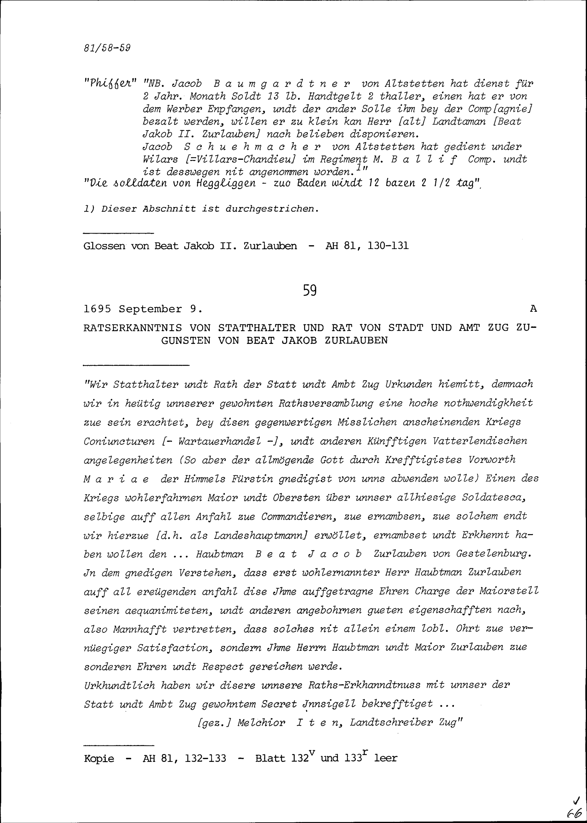 Verzeichnis der Rekruten, welche von Balthasar Meyer, von Hägglingen in der Grafschaft Baden und im Rheintal für die Gardekompanie von Beat Franz Plazidus Zurlauben beziehungsweise die Kompanie von Beat Jakob II. Zurlauben im Regiment Pfyffer geworben worden