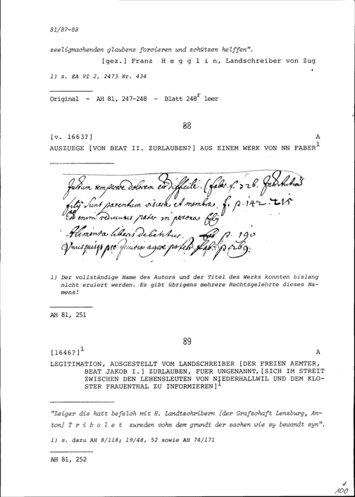 Legitimation, ausgestellt von Beat Jakob I. Zurlauben, Landschreiber der Freien Ämter, für ungenannt, sich im Streit zwischen den Lehensleuten von Niederhallwil und dem Frauenkloster Frauenthal zu informieren