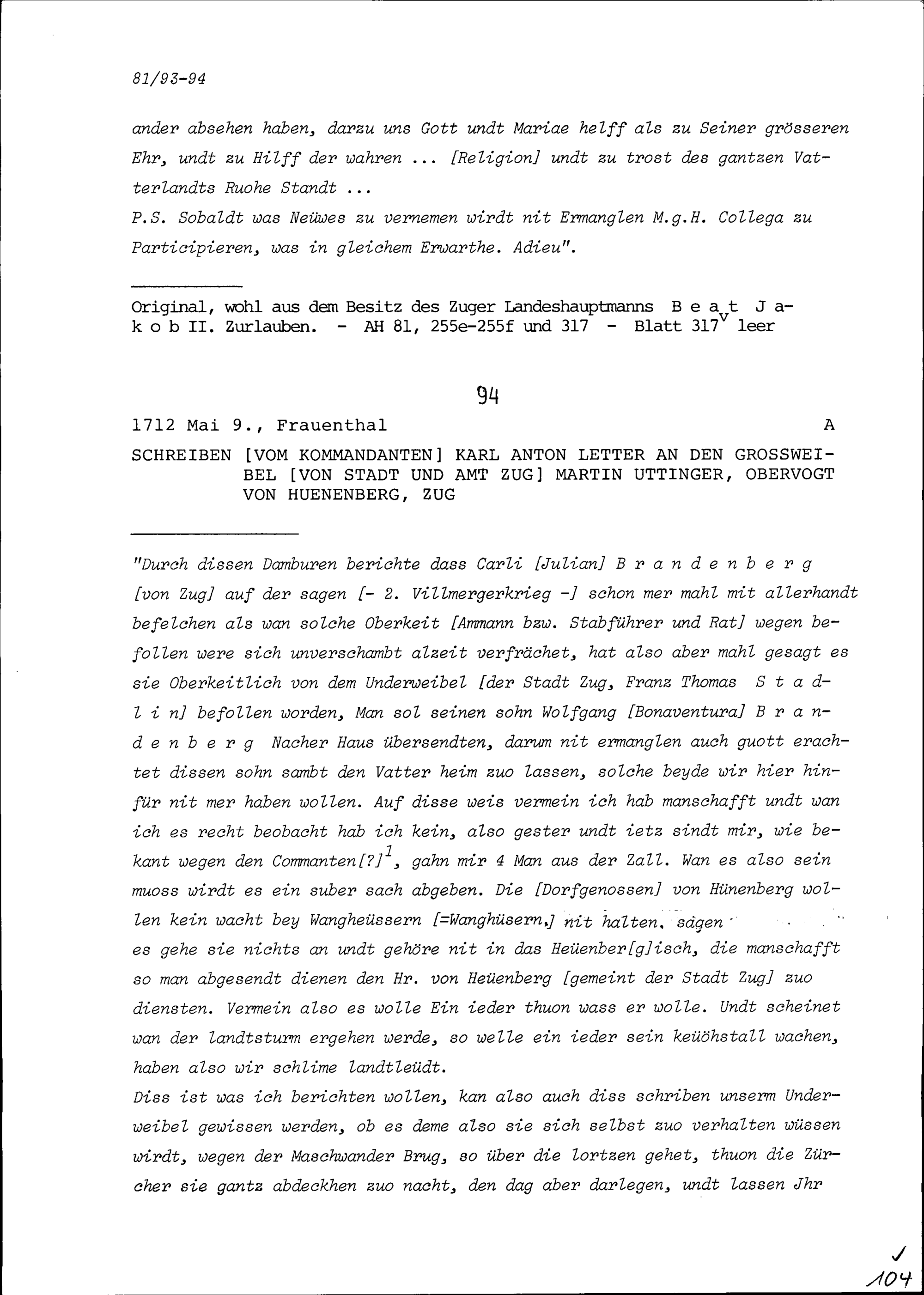 Schreiben von Heinrich Ludwig Göldlin von Tiefenau, Luzerner Ratsherr, an Karl Anton Letter, Kommandant von Frauenthal