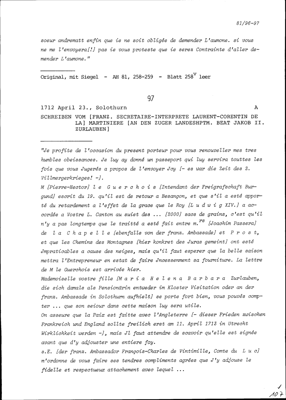 Schreiben von Anna Maria Theresia Zurlauben an Beat Jakob II. Zurlauben, Landshauptmann, Zug