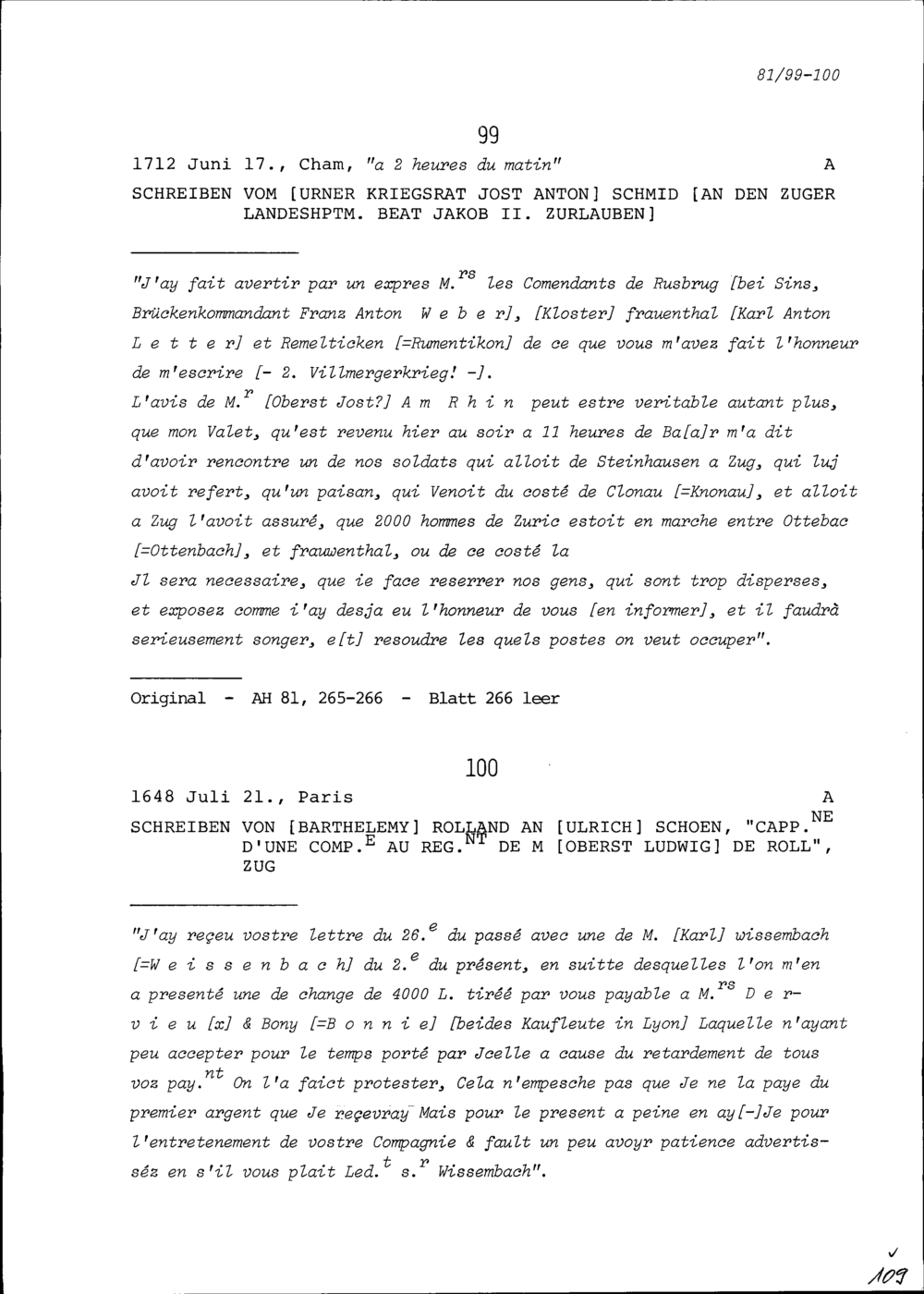 Schreiben von Barthélémy Rolland an Ulrich Schön, Hauptmann einer Kompanie von Oberst Ludwig de Roll, Zug