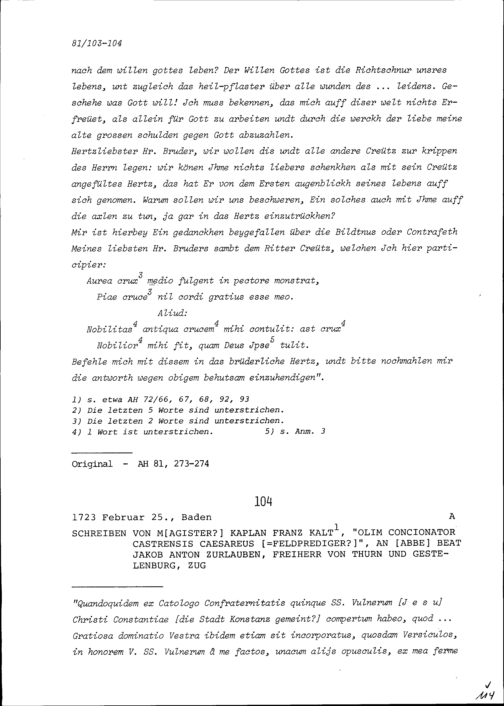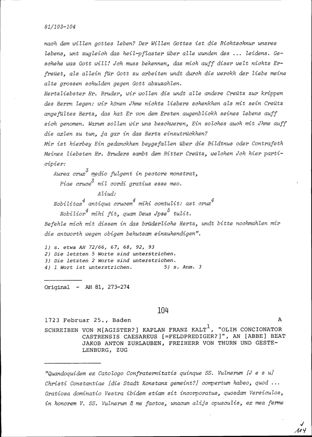 Schreiben von Augustin Zurlauben, Benediktinerpater, an Beat Jakob Anton Zurlauben, Priester