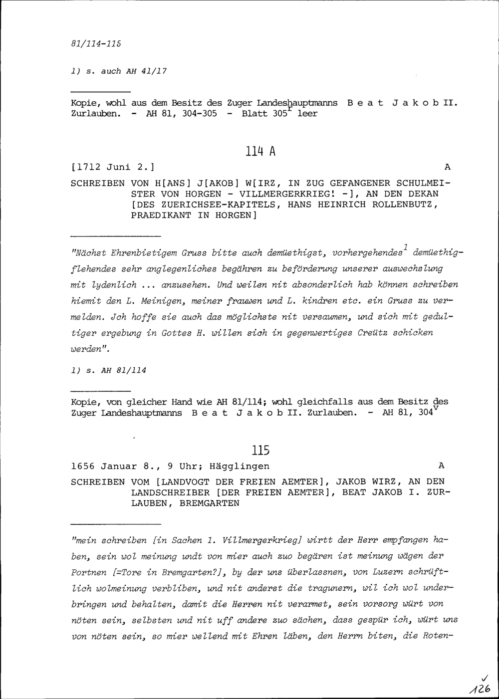 Schreiben von Erhard Herrliberger, in Zug gefangener Theologiestudent, von Hans Jakob Wirz, Schulmeister von Horgen, und Jakob V. oder U. Peter, von Arn an Hans Heinrich Rollenbutz, Dekan des Zürichseekapitels und Prädikant in Horgen