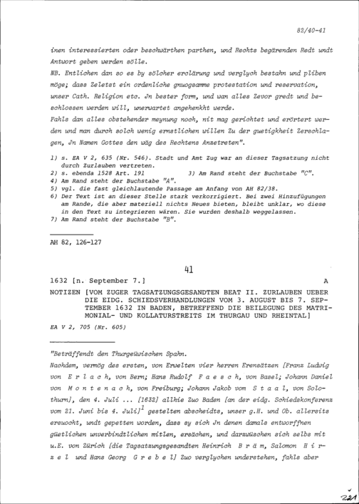 Notiz von Beat II. Zurlauben, Zuger Tagsatzungsgesandter, über die eidgenössischen Schiedsverhandlungen vom 3. August bis 7. September 1632 in Baden