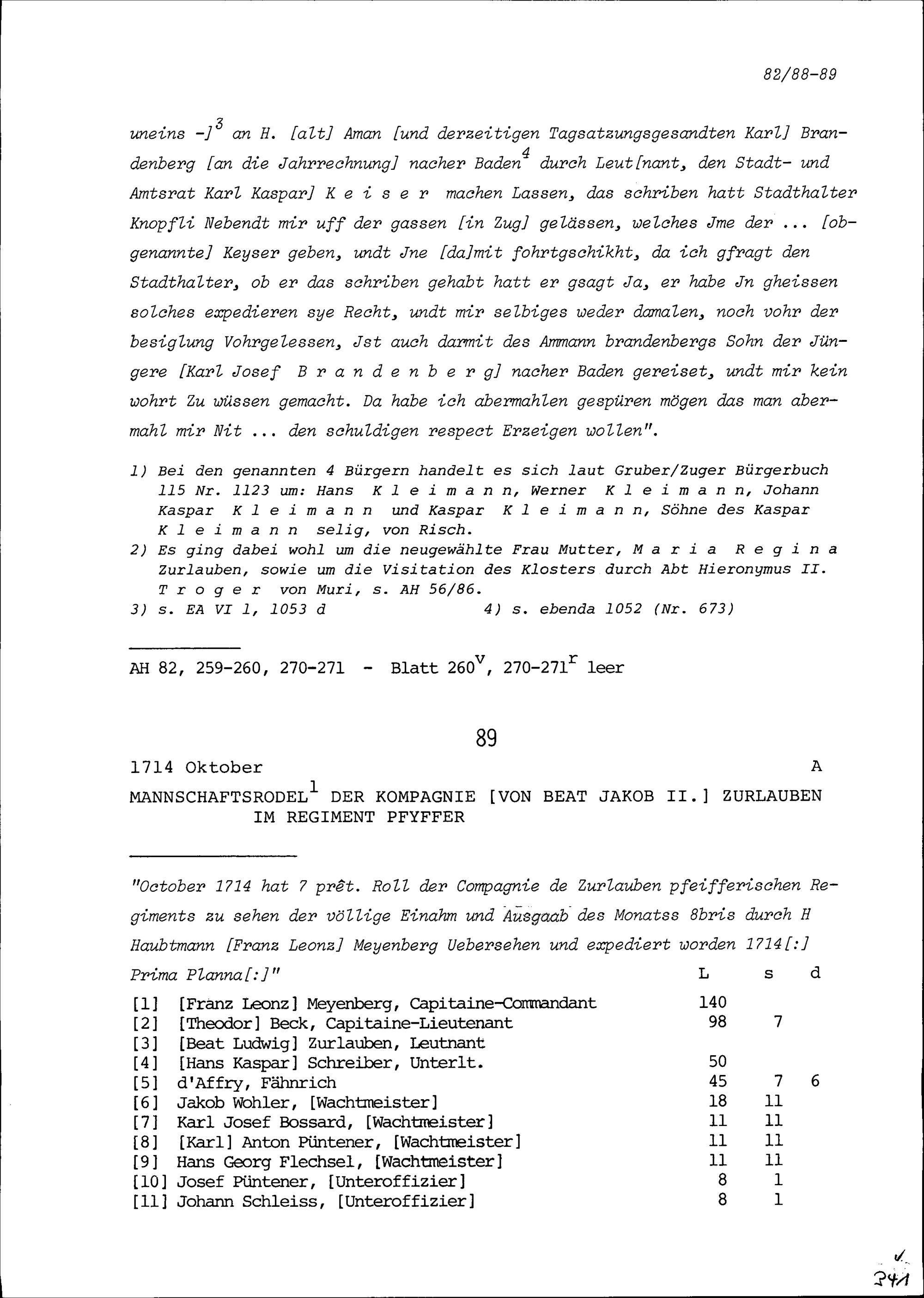 Notiz von Beat Jakob I. Zurlauben, Ammann Zug, über Kaspar Knopfli, Statthalter