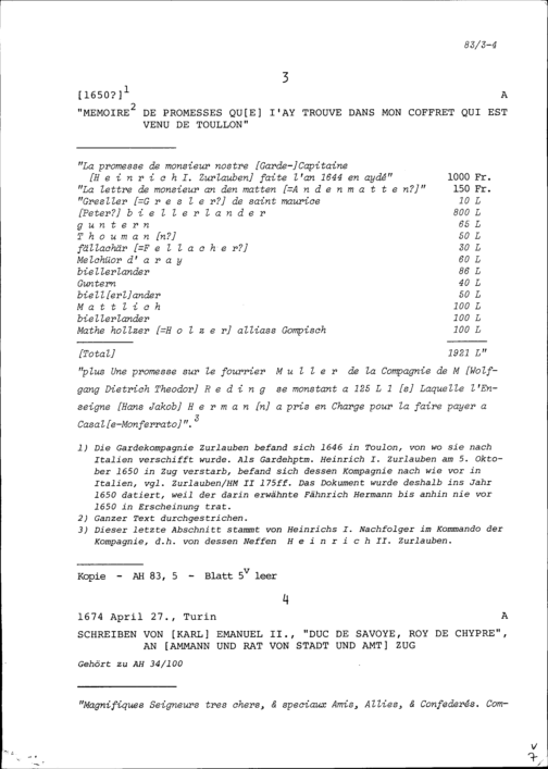 Schreiben von Karl Emanuel II., Herzog von Savoyen, an Ammann und Rat von Stadt und Amt Zug